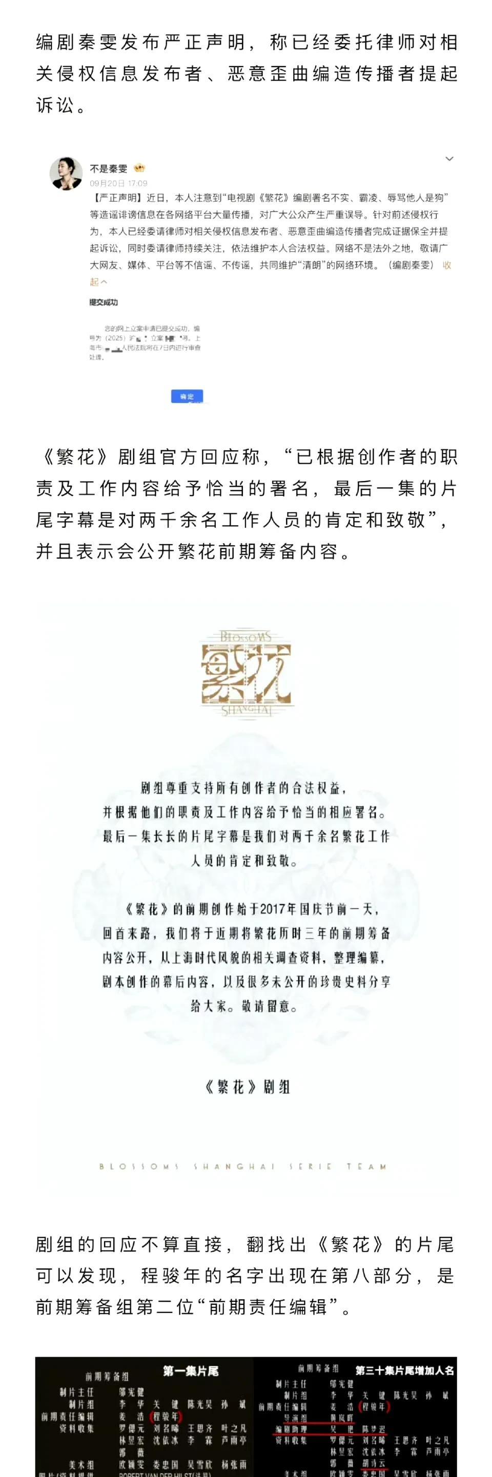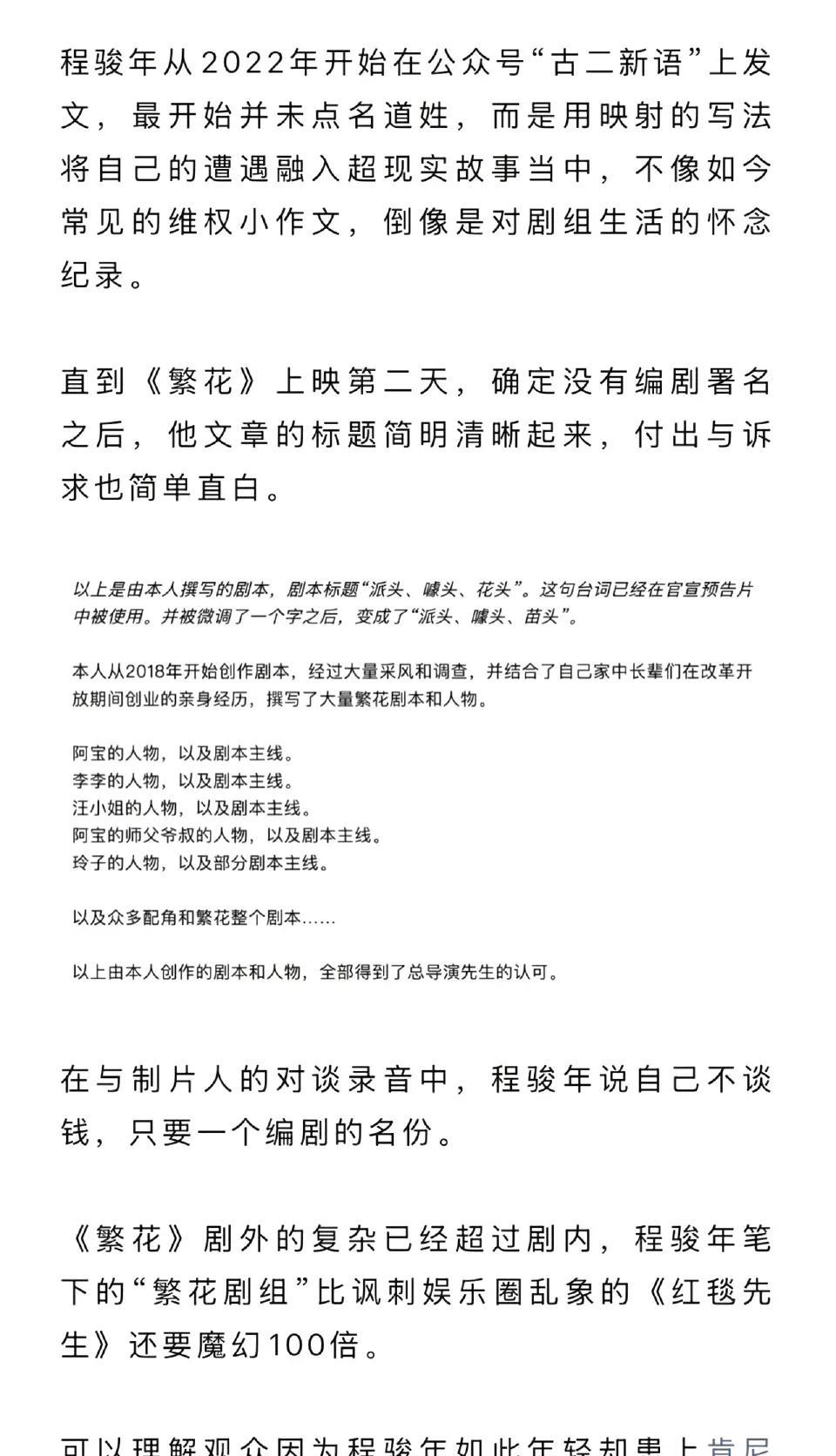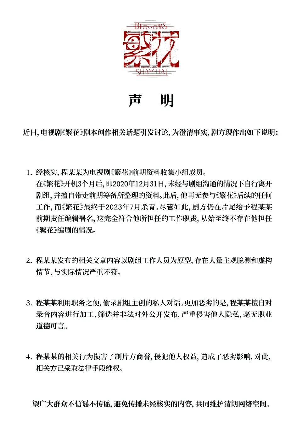 《繁花》剧组发声明了,我来翻译一下。 第一,程骏年说谎,他从未担任过《繁花》编剧
