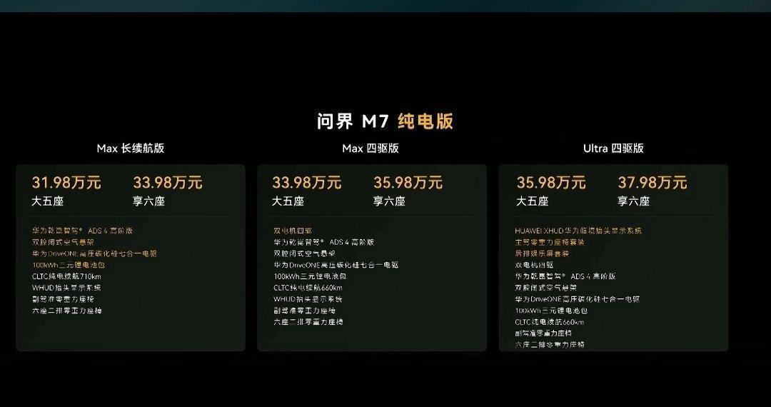 问界M7,纯电,31.98-37.98万;增程,27.98-35.98万! M9