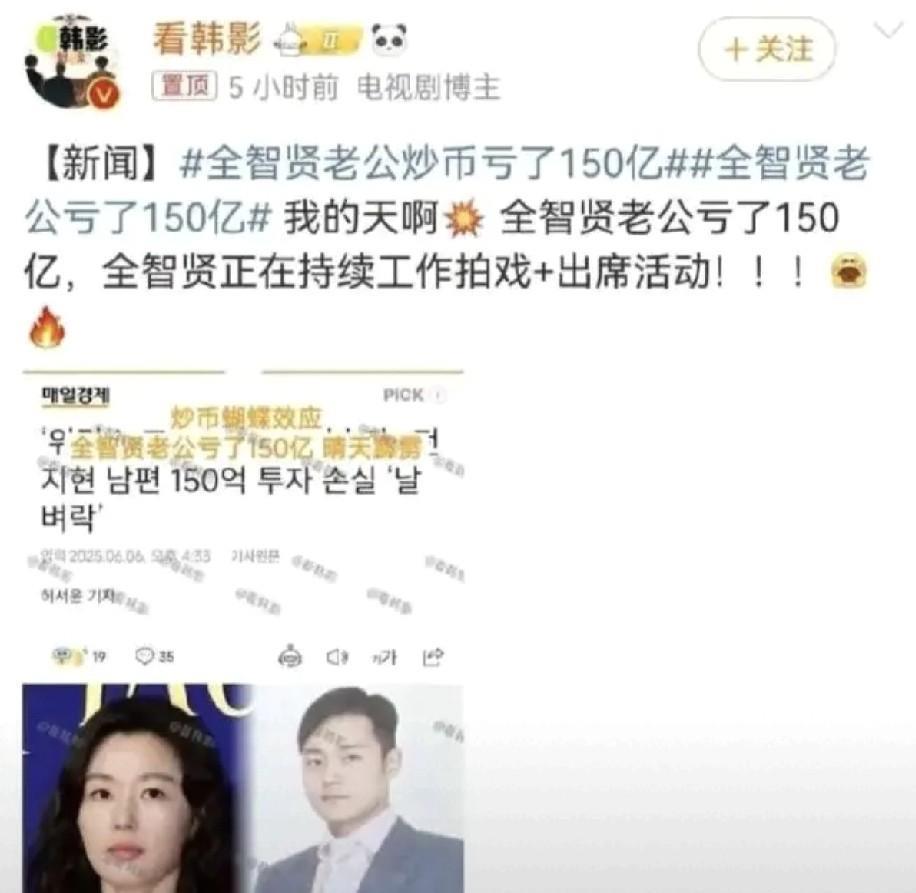 全智贤的天塌了!以后她想再赚中国人的钱,难哪! 她主演的辱华剧《暴风圈》,里面的辱华言论彻底惹怒了中国人民,很多代言都解除了跟她的合作。 这一幕也引发了网友的热议。 有的网友说:全智贤可真倒了八辈子血霉,对中国历史的不了解,被仇恨中国的人乱加台词导致的。 有的网友说:没必要上纲上线,她是韩国人,而不是中国人。中国对于她来说就是外国而已,这不影响她在自己国家和其他国家挣钱。 再说她只是演员,演员按照剧本台词演没问题。 有的网友说:演员也要有做人基本的底线,像这种端碗吃饭放碗骂娘的坚决抵制! ………… 其实我觉得这些个演员真是不聪明,你说你端着中国人的饭碗吃饭,放下碗来却骂娘,这样地做法谁会甩你? 又想赚中国人的钱,又不尊重中国人的历史,又伤害中国人民的感情,你以为你是谁哦? 这下好了,赚不到中国人的钱了, 你富豪丈夫亏的150亿韩元,你拿什么还哦[捂脸]。 想想之前有个韩星张娜拉,当时在中国可是火的要命,那你看现在还有她的声音吗?