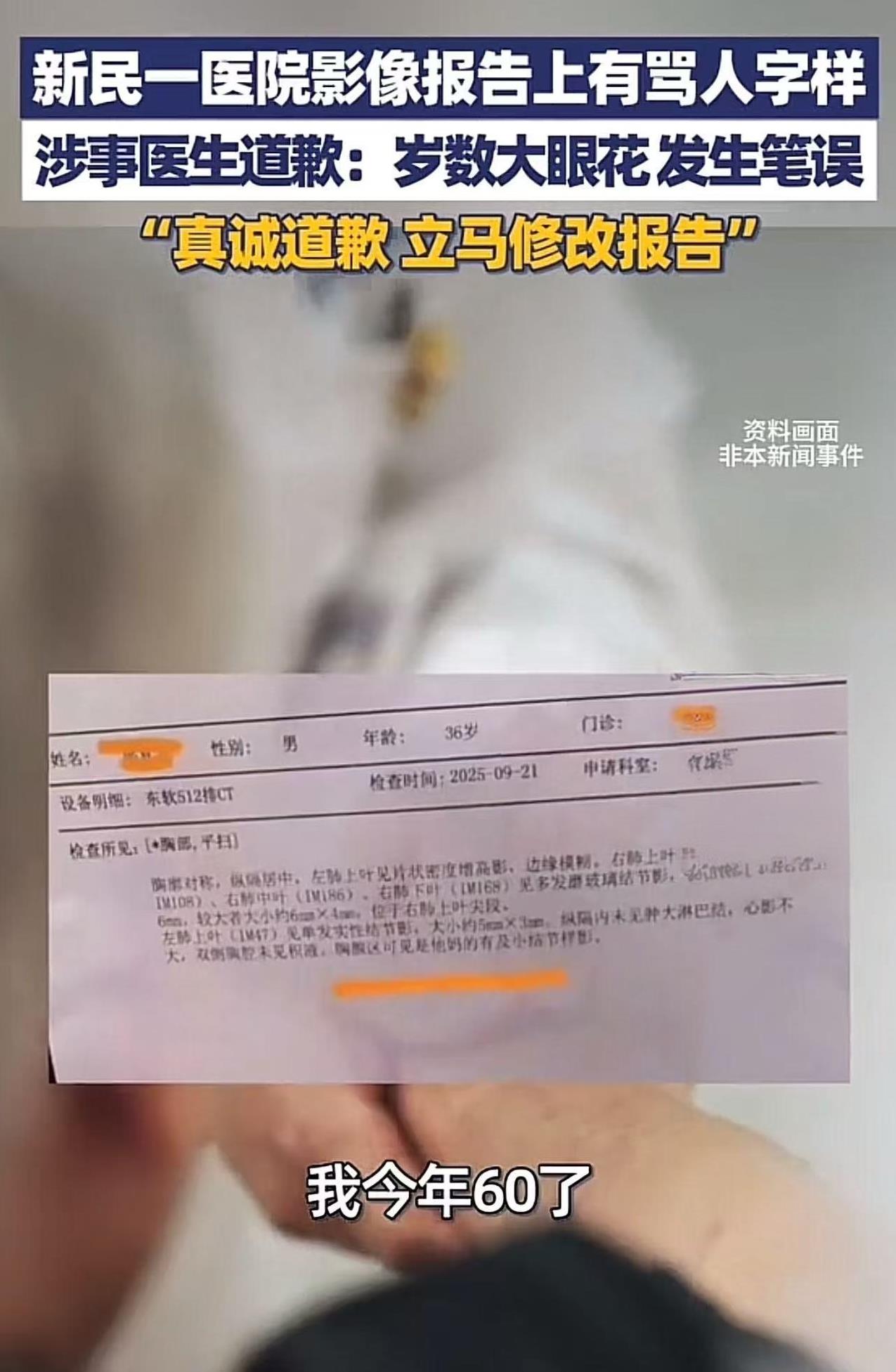辽宁新民,男子去医院看病,拿到CT检查报告懵逼了,上门居然有骂人的字样!男子:“我花钱来看病,还要被骂!”涉事医生:“岁数大眼花,打错字了,真诚道歉!”网友:你要是把药也看错了怎么办,年龄不行了就应该及时退出岗位,干力所能及的事情! 男子最近感觉呼吸不太顺畅,心里一直七上八下的,担心自己身体出了什么大毛病。 为了图个安心,他便前往医院看病。到了医院,医生仔细询问了情况后,建议他做个肺部CT,看看肺部有没有结节之类的异常情况。 男子听了医生的建议,乖乖去做了检查。做完检查后,男子怀着忐忑不安的心情去拿报告。 他在心里默默祈祷,希望自己只是虚惊一场,身体没什么大问题。 可是当他拿到报告,定睛一看,瞬间就傻眼了——报告上竟然出现了“他 妈的”这样骂人的字样! 男子心里直犯嘀咕:“我花钱来医院看病,怎么反倒被医生骂了呢?” 越想越气的他,把这件事情发到网上,让大家来评评理。 很快,这件事情就在网上引起了轩然大波。涉事医生赶忙出来解释并道歉。 医生说:“实在是对不起啊,我真的错了,我在这里真诚地道歉。我今年60岁了,眼睛有点花了,而且当时患者比较多,忙中出错,不小心把字打错了,真的不是故意的,对不起!” 此事引发了热议,有网友说,拼音打字,加上联想功能,这样的错误可以理解,医生已经道歉了,并非主观故意。 ,以后打字完了,要仔细默读一遍,避免类似的事情再次发生。 也有网友说,病例这么严肃的事情,不允许出错。错了就得承担后果,道歉有屁用! 还有网友说,打错了可以理解,人都有失误的时候,但是这不应该还有审核吗?很明显没按规范没有审核,直接用了审核医生的电子签名就出报告。 我觉得,这是真打错字了,有时候我自己也是连着打好几个字,以为对的等都打完一看错的,所以这种行为能理解。 但是,医生作为一个特殊的职业,肩负着救死扶伤的重任,每一个诊断、每一个处方都可能影响患者的健康和生命。 年龄大、眼花或许可以成为犯错的借口,但却无法成为推卸责任的理由。 如果因为年龄问题而频繁出现失误,不仅会损害患者的利益,也会破坏整个医疗行业的形象。 在医疗领域,专业和严谨永远是第一位的,任何的疏忽和懈怠都可能带来无法挽回的后果。 与其用年龄作为挡箭牌,不如正视自身能力与岗位要求的差距,该退则退,把位置让给更能胜任的人,这才是对患者负责、对医疗事业负责的态度! 那么,你对此事怎么看呢? (来源:大象新闻)