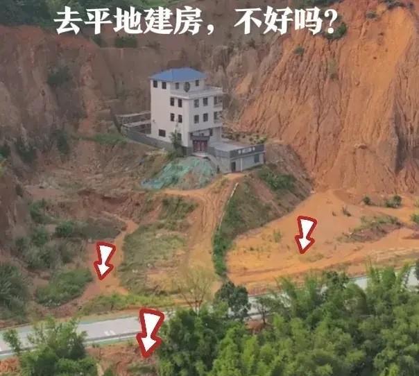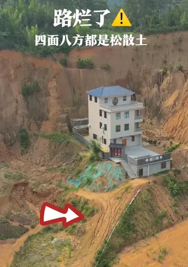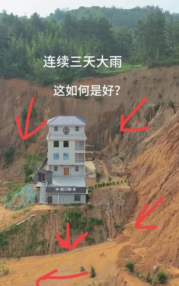 台风带来狂风暴雨,很多房子瑟瑟发抖, 比如下面这栋位于土坡上的自建房, 已经连续几天下雨,回家的路没法走, 周边还有滑坡风险,这如何是好? 这个宅基地,也不知道是怎么选的, 竟然三面环山,又远离道路, 远在半山上建房,交通很不方便, 虽然3层半的房子很漂亮, 但尴尬的是,房子周边水土流失严重, 如果再下暴雨,可能还有滑坡风险, 你说修挡土墙吧, 这个费用,可能比建房子还贵, 因为需要挡土的地方太多了, 还要在黄色线条处,修建截水沟[流泪][流泪] 对于你们懂建房的朋友, 这是应该花重金修挡土墙? 还是换宅基地建房? #万能生活指南#