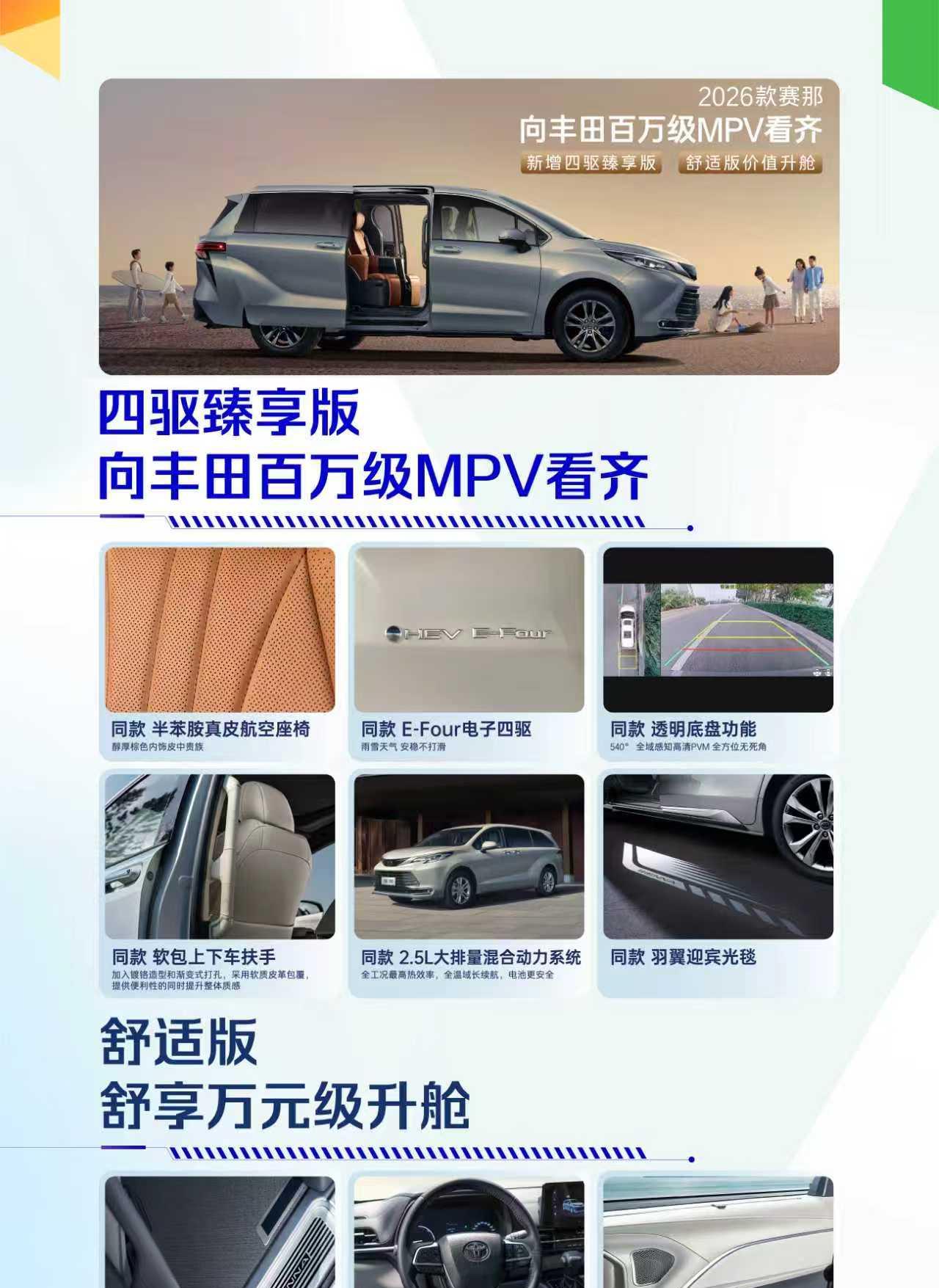 购车成本大降!广丰96期低息政策+全系高配引爆市场 9月23日,广汽丰田2026款全球车发布会释放重磅信号,行业首个96期超长期低息金融政策的推出,直击当下消费者购车压力大的痛点。数据显示,当前贷款购车占比极高,每10台新车中有7台靠贷款,8年低息政策显著减轻了月供负担。 产品升级同样不负期待:赛那首推电子四驱+航空座椅款,搭配迈巴赫同款半苯胺真皮座椅;汉兰达全面进入智能大屏时代,15.6寸大屏与8155芯片成为全系标配,入门版质感升级;锋兰达入门款配8向电动座椅,12.9寸大屏与TSS系统提升竞争力。 三大智能平权同步实现:动力上电混技术全系0价差,智驾端安全系统全面覆盖,智舱内豪华配置下放。高配置叠加低门槛,购车时机已然成熟。#行业首个超长低息金融政策# #行业首个超长低息金融政策# #广汽丰田2026款新车上市#