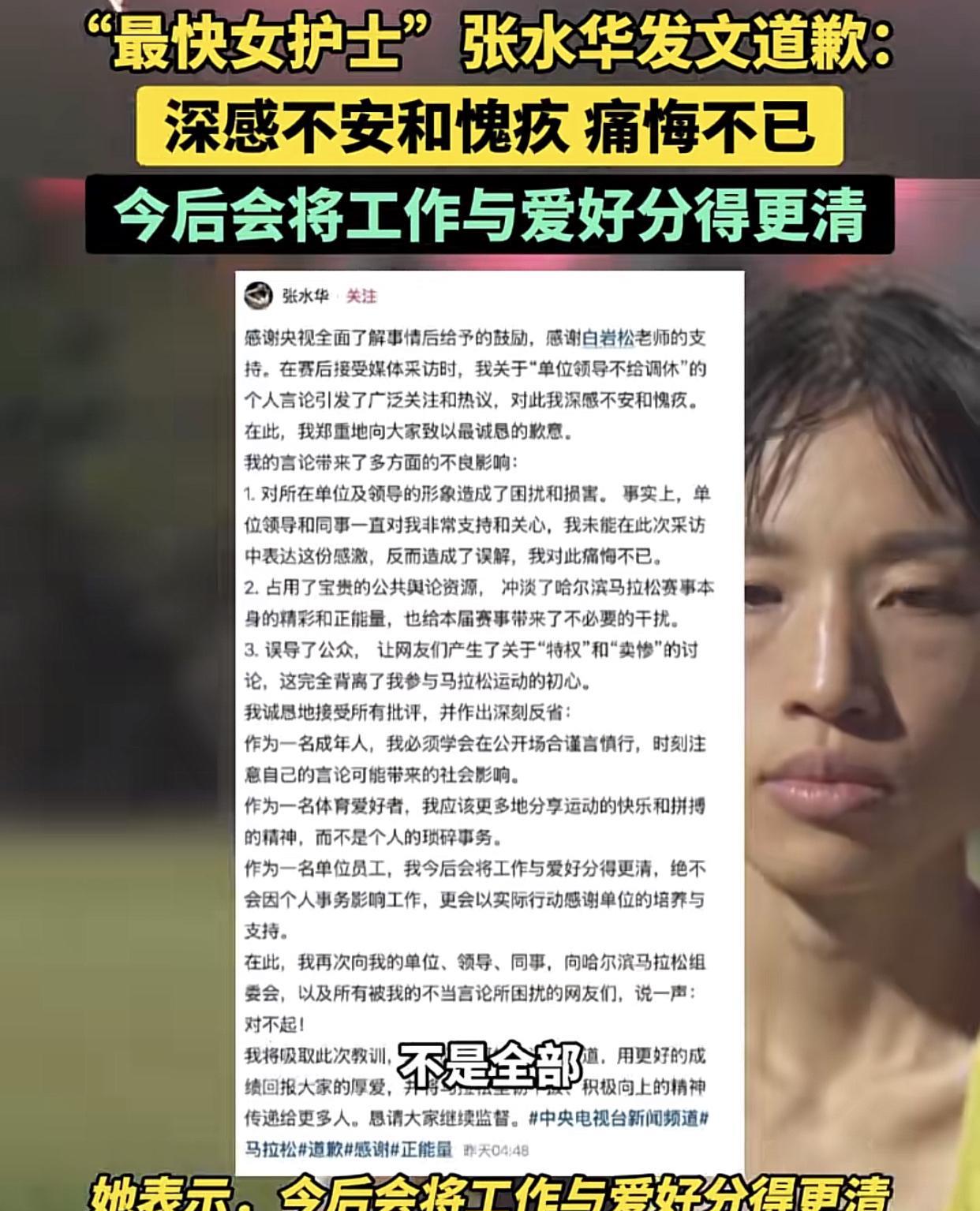 护士张水华道歉了: “我只是把马拉松当成自己生活中的一部分,不是全部,这把工作和