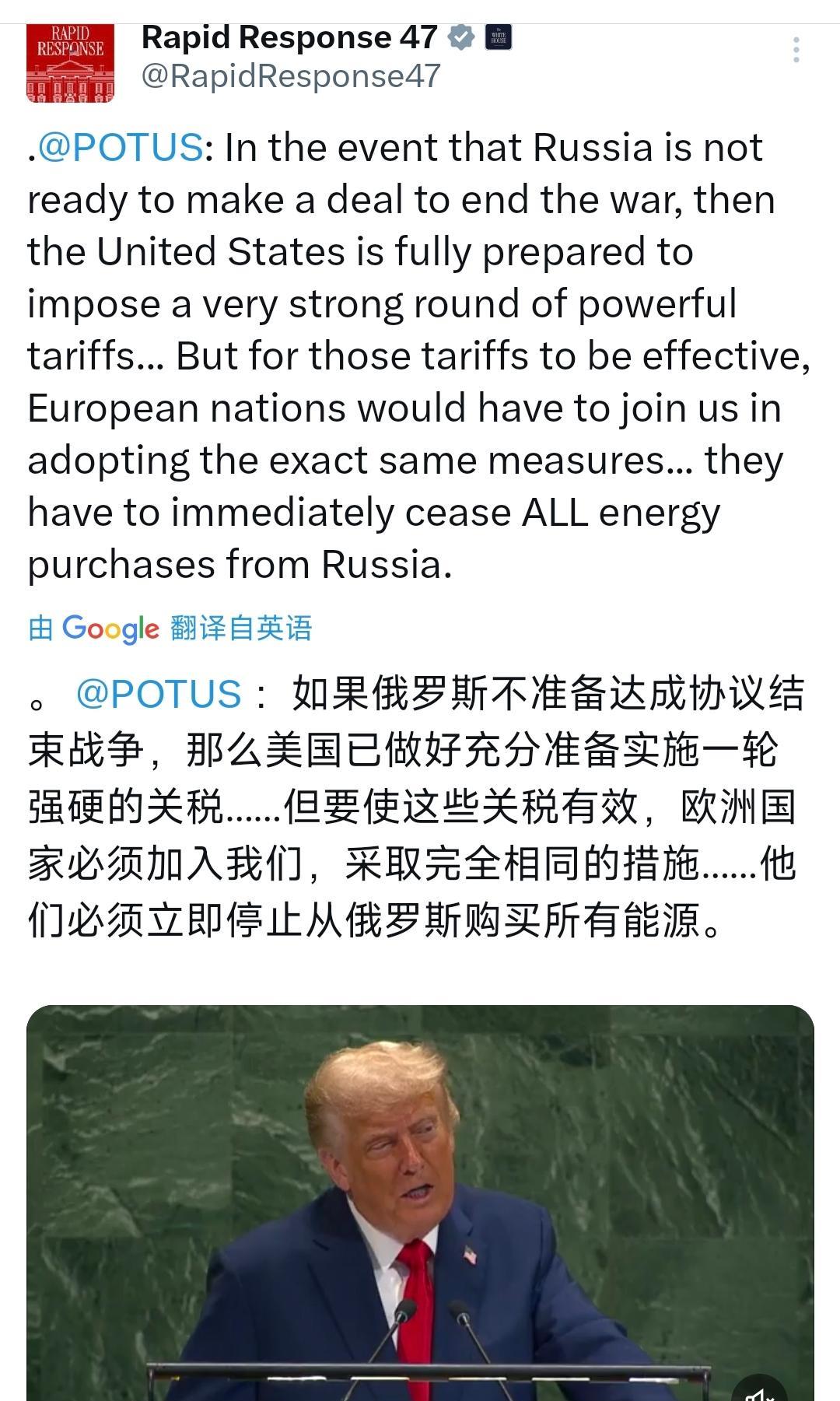 特朗普在今晚(北京时间9月23日晚)的联大讲话中再次谈到俄罗斯:“如果俄罗斯不准备达成协议结束战争,那么美国已做好充分准备实施一轮强硬的关税.....但要使这些关税有效,欧洲国家必须加入我们,采取完全相同的措施......他们必须立即停止从俄罗斯购买所有能源。” [机智]评几句:特朗普在联大讲话中又开始了强力施压,可回头看看,从当初信誓旦旦宣称24小时解决俄乌冲突,到如今上任都8个多月了,他连解决冲突的钥匙在哪都没摸着。嘴上说着强硬关税,拉欧洲入伙搞能源脱钩,不过是不知所措下的虚张声势。解决国际冲突哪能靠这种简单粗暴的手段?他这“美国优先”的思维,除了把局势搅得更乱,根本拿不出实质有效的办法,不过是徒留笑柄罢了。