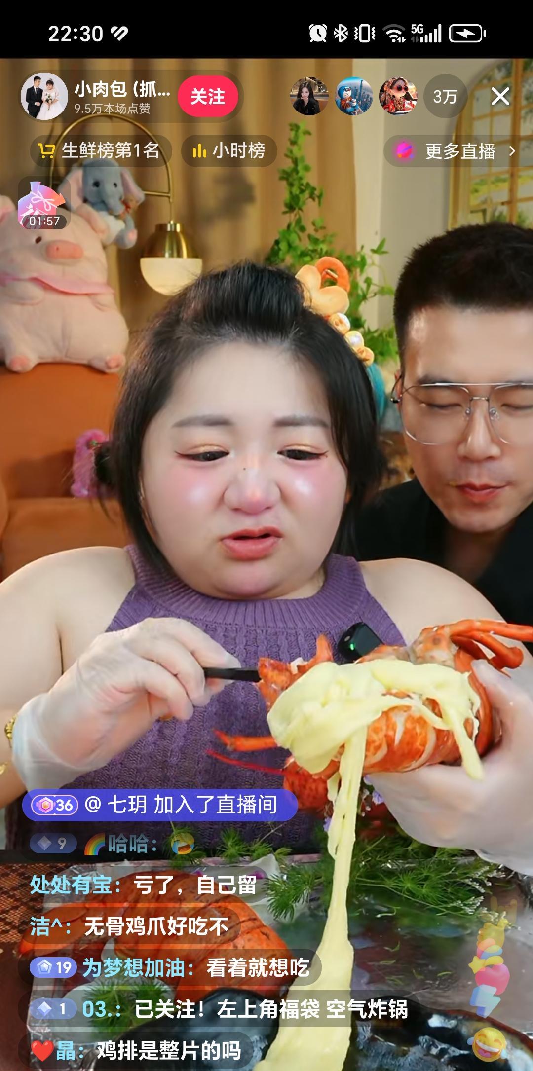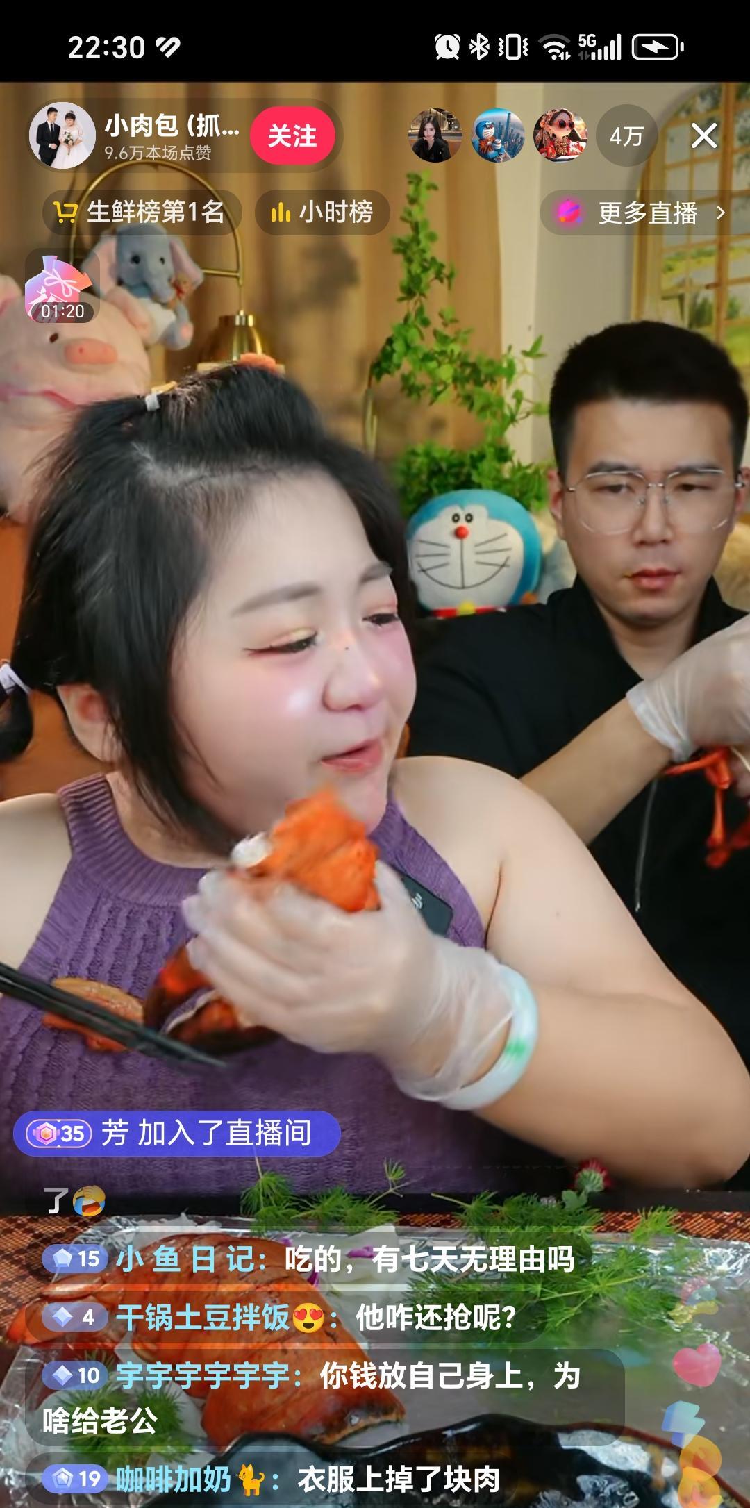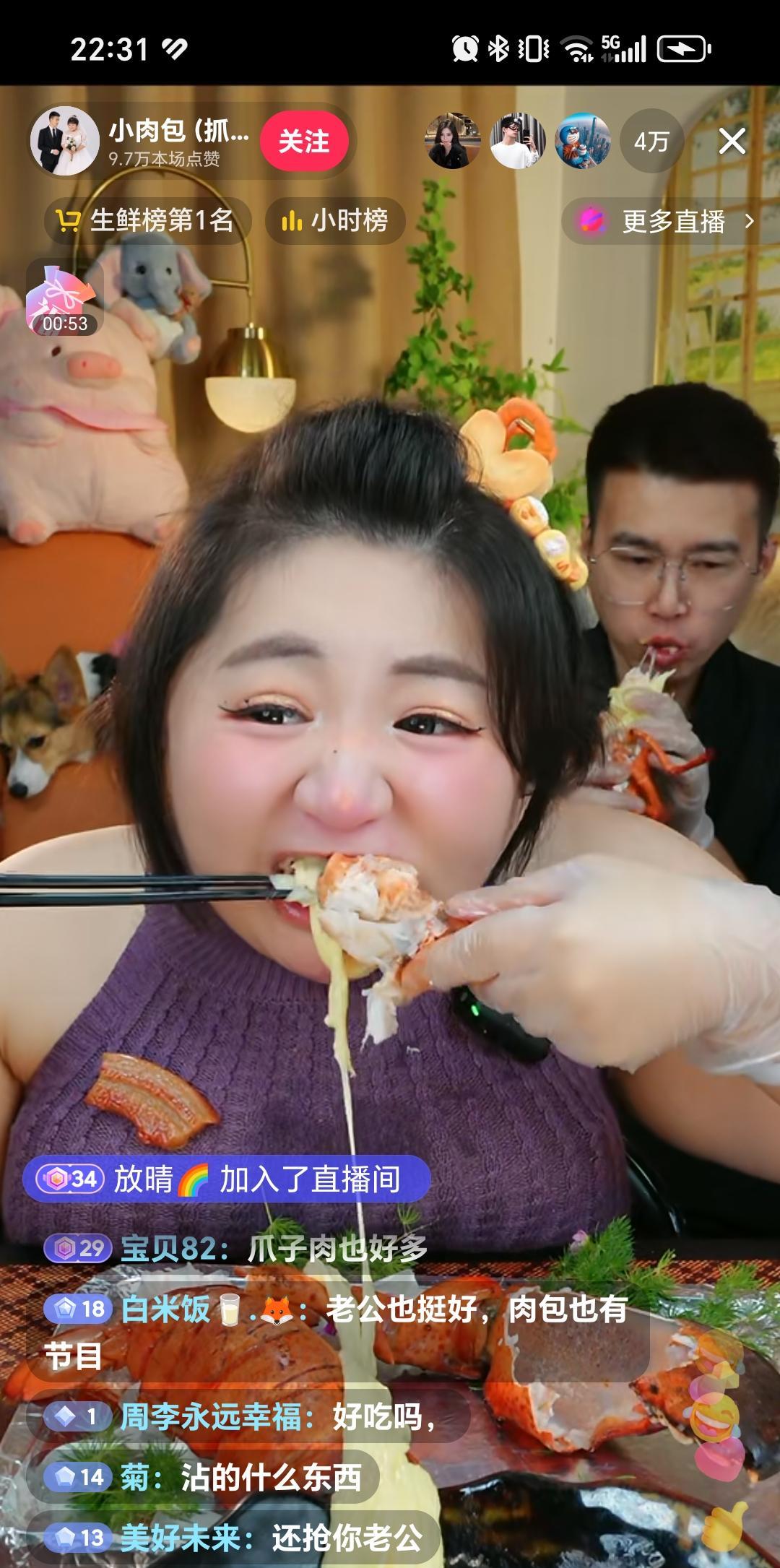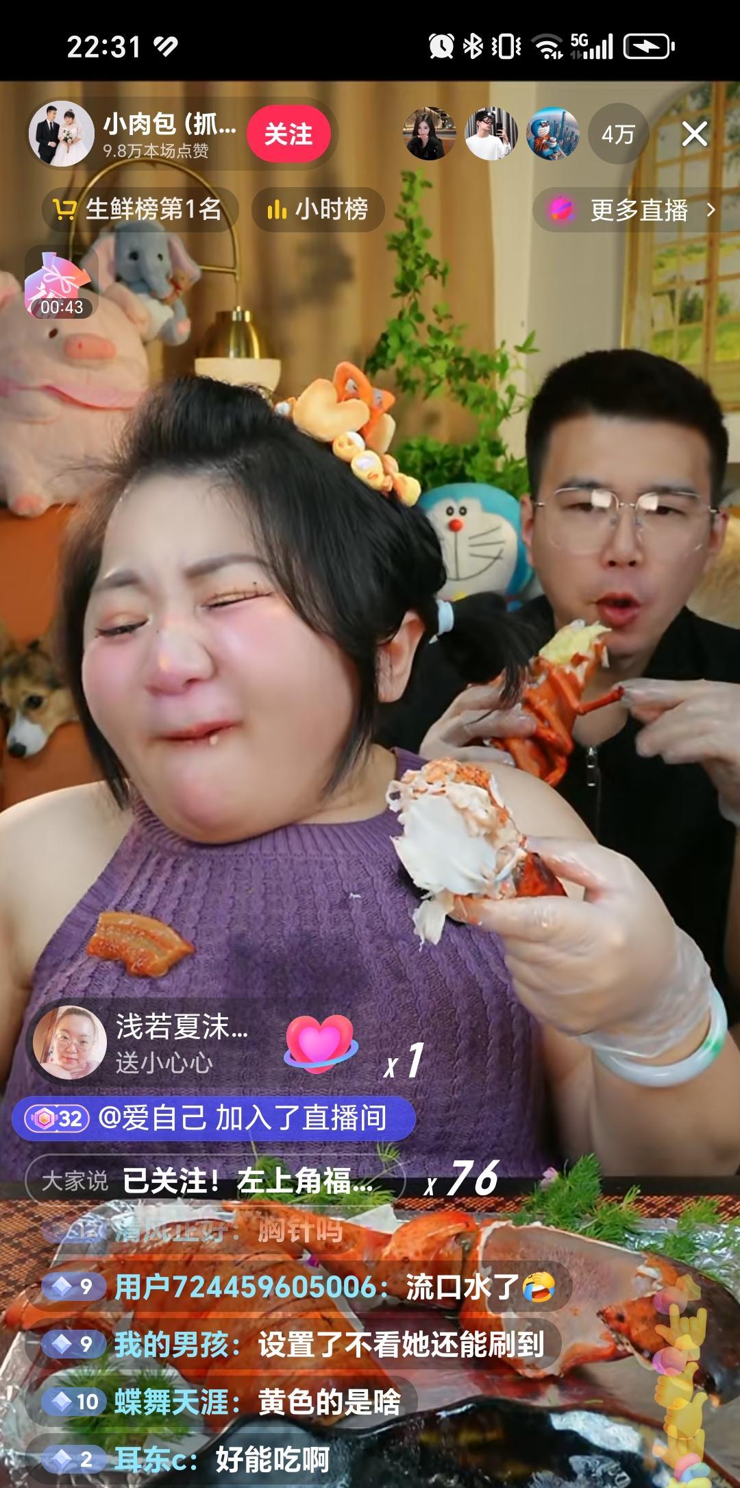 9月23日小肉包这个主播很有意思,晚上看他直播的快六万人了,这个主播很能吃,讲话很有意思。胸前挂一块五花肉挂件,经常讲自己和老公老赵的故事,自己1.2米,老公1.7米多的正常人两个人直播天天吃,老公心疼他就抢着吃。感觉两个人很恩爱,老婆虽然不能出门但是有老公天天陪伴直播也很幸福。 这个女孩长的很喜庆有眼缘,有时候不买东西听他说话也有意思。 吃太多了总感觉身体不健康.这些吃播太能吃了我感觉他一顿赶我一星期的饭量了。