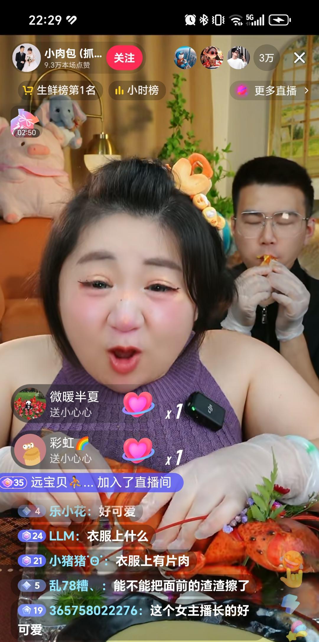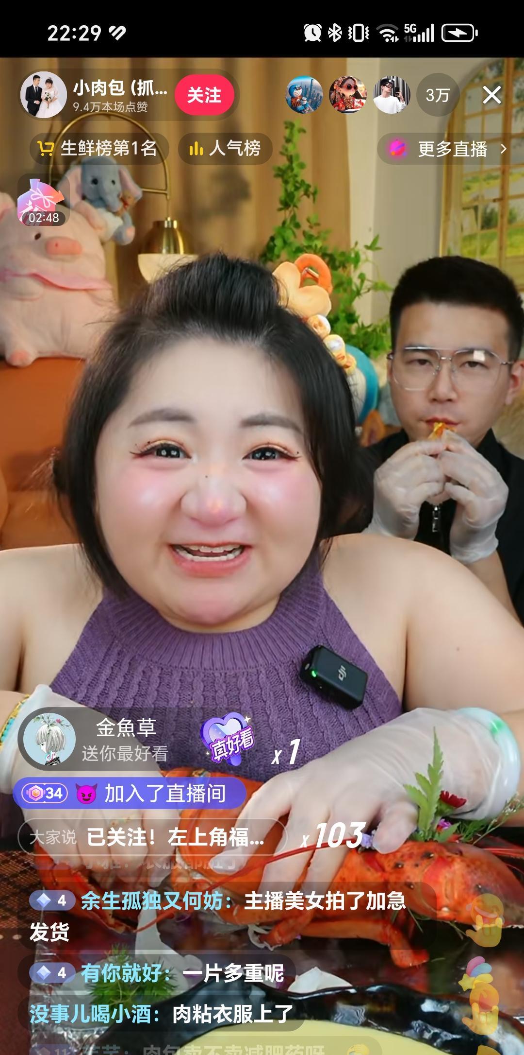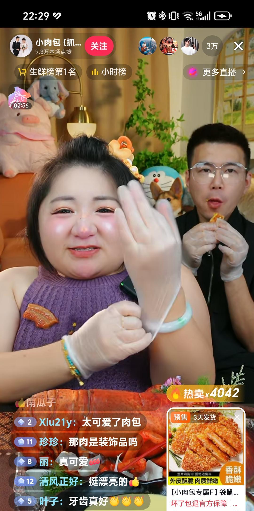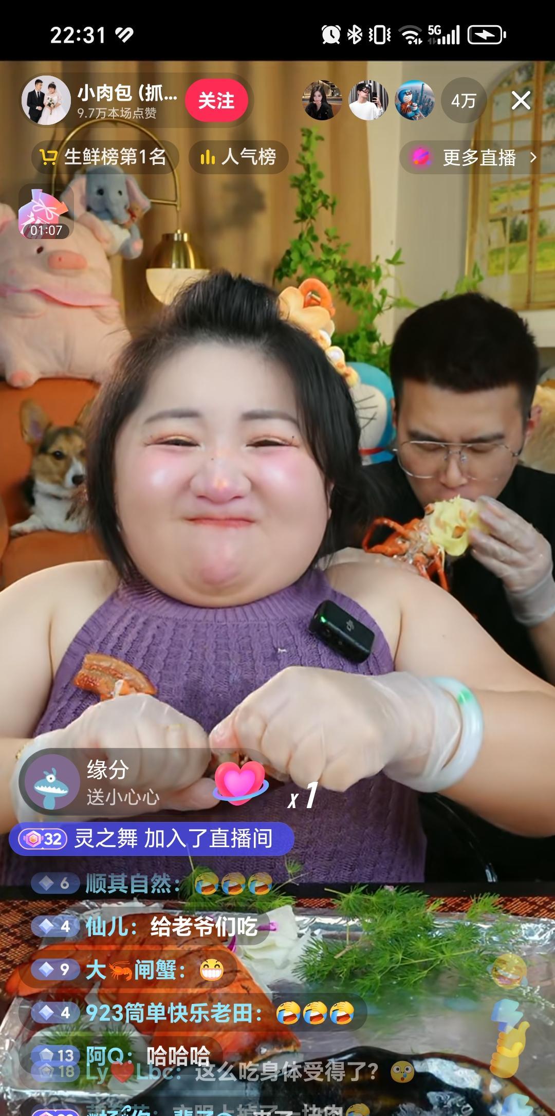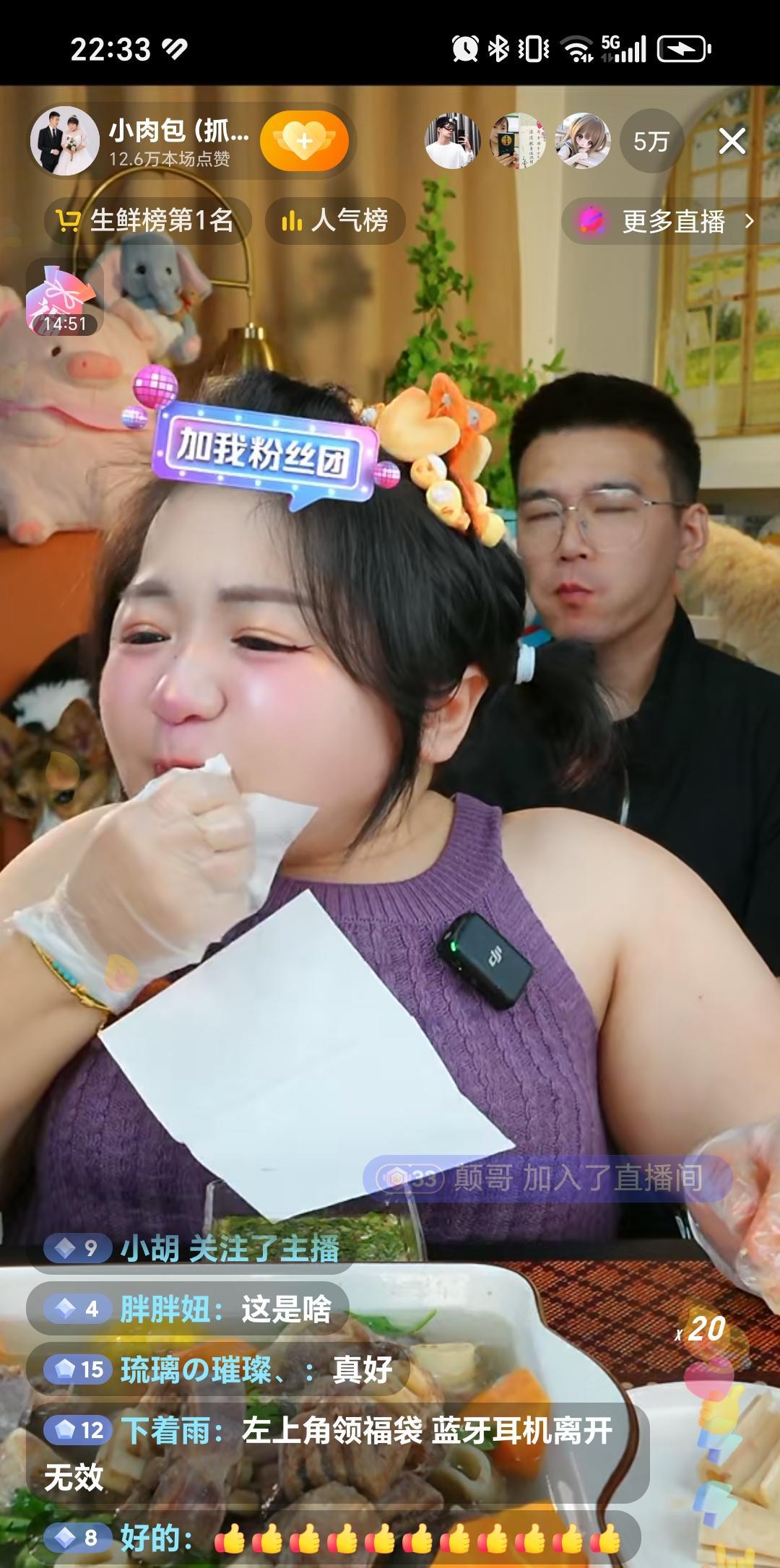 9月23日小肉包这个主播很有意思,晚上看他直播的快六万人了,这个主播很能吃,讲话很有意思。胸前挂一块五花肉挂件,经常讲自己和老公老赵的故事,自己1.2米,老公1.7米多的正常人两个人直播天天吃,老公心疼他就抢着吃。感觉两个人很恩爱,老婆虽然不能出门但是有老公天天陪伴直播也很幸福。 这个女孩长的很喜庆有眼缘,有时候不买东西听他说话也有意思。 吃太多了总感觉身体不健康.这些吃播太能吃了我感觉他一顿赶我一星期的饭量了。