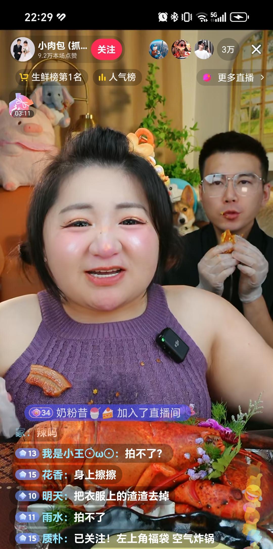 9月23日小肉包这个主播很有意思,晚上看他直播的快六万人了,这个主播很能吃,讲话