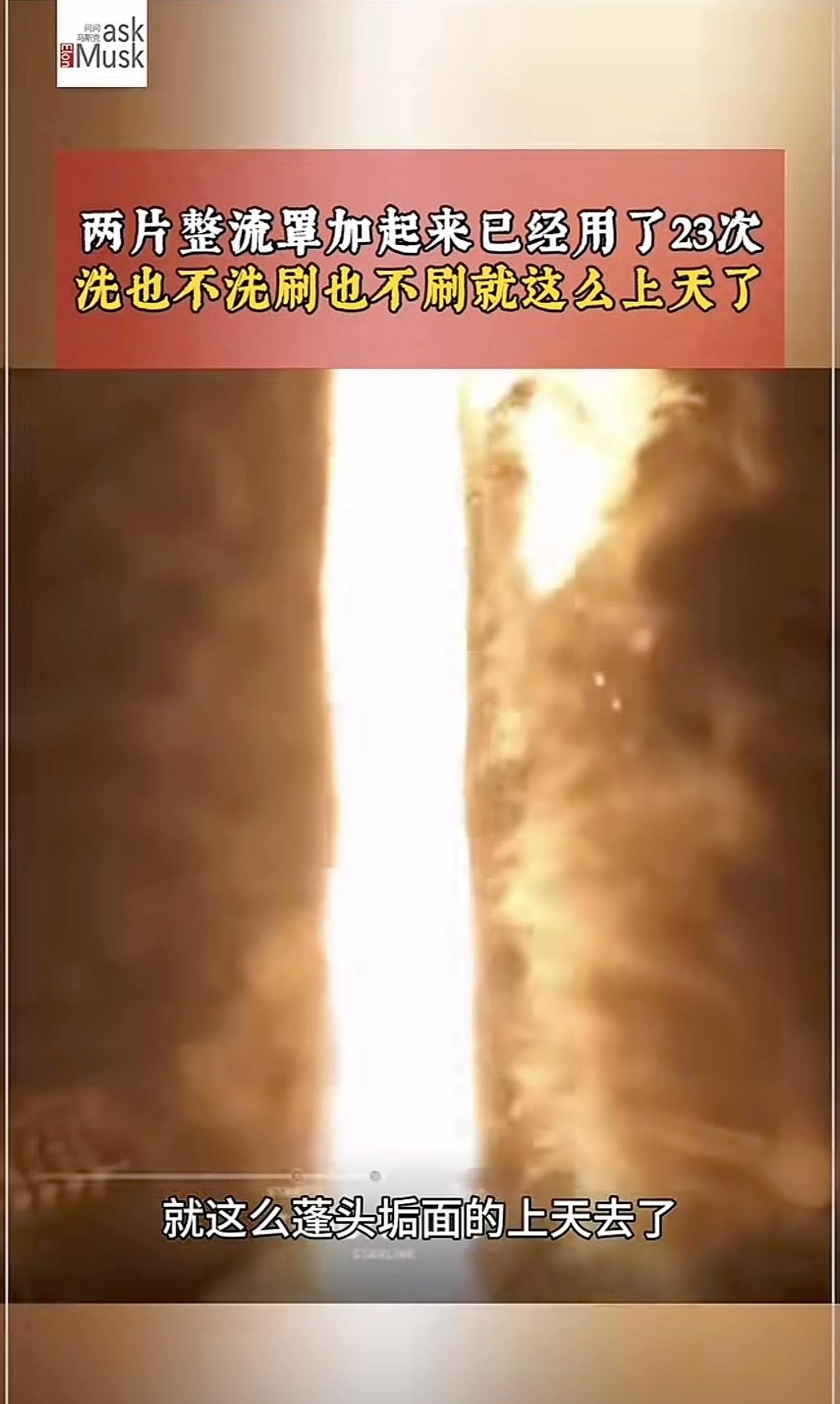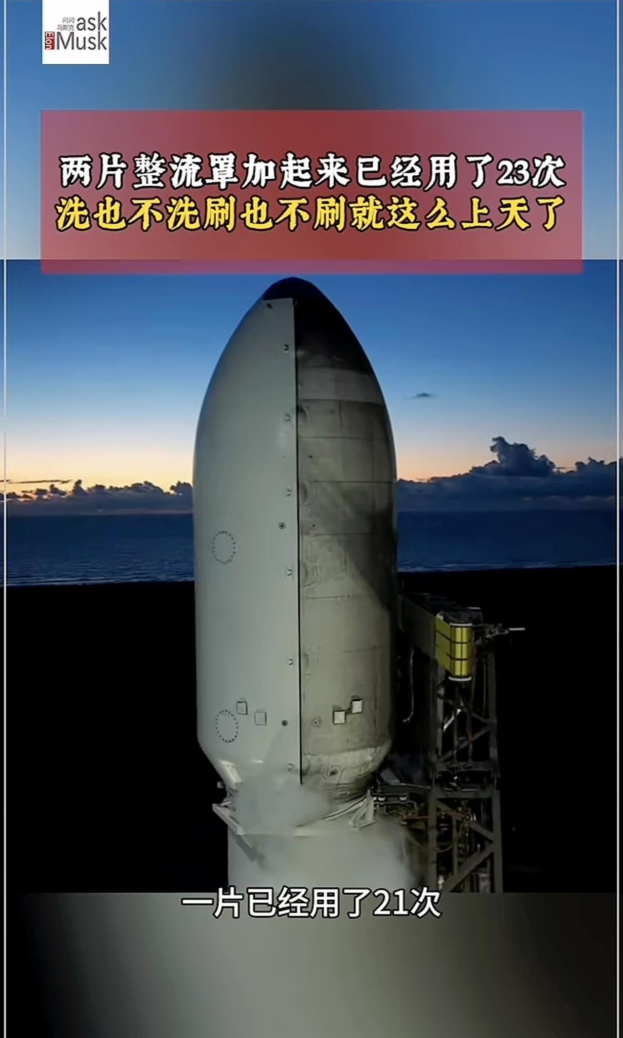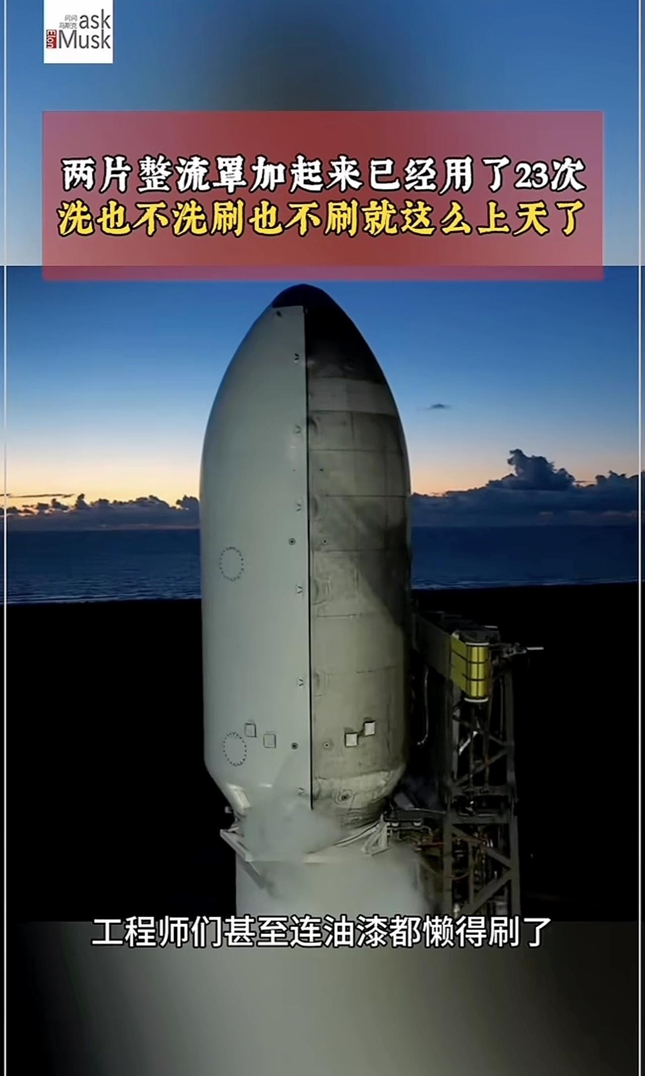 马斯克的spacex刷新人类认知,让神秘复杂的事情变得简简单单。马斯克不愧是务实科技狂人,令世界瞩目又望尘莫及,他的spacex用不锈钢就算了,连两片整流罩都是回收利用的,反反复复加起来用了23次,工程师们连油漆都懒得刷了,就这样蓬头垢面也阻止不了上天的脚步。