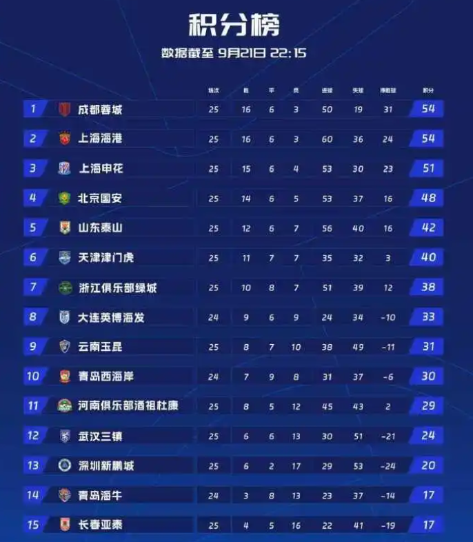 中超联赛积分榜榜首争夺异常激烈,成都蓉城与上海海港同积54分并列第一。最后5轮比赛,两队都要对阵浙江队,后者的战意和临场发挥,将决定本赛季冠军归属。