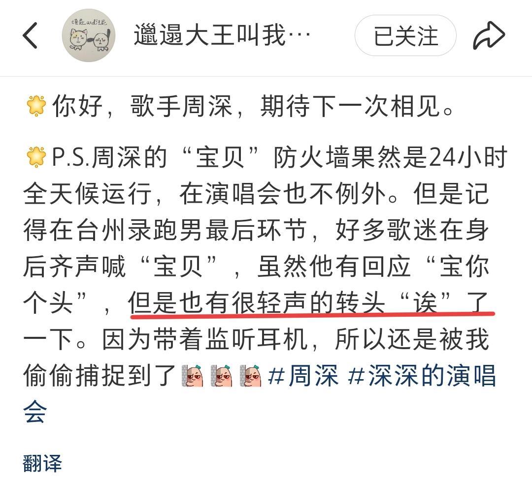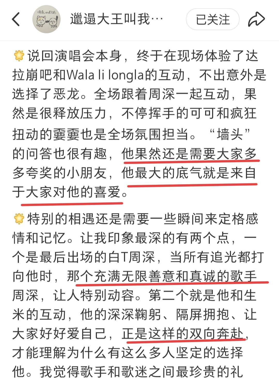 这一次是歌手周深! 上次周深杭州大莲花演唱会,跑男摄影师也去了,还发了repo! “他果然还是需要大家多多夸奖的小朋友,他最大的底气就是来自于大家对他的喜爱。” 是呀,他是个特别没有安全感的人,去年9.29Hz演唱会的时候就说过,害怕演唱会门票不好卖,今年“深深的”已经自信很多了! “我觉得歌手和歌迷之间最珍贵的礼物,就是随着时间地推移,彼此在对方身上造成的改变,让自己成为更好的自己。” 这段话写的太好了! 生米的爱让他慢慢长出血肉,他被爱意包围着的时候很幸福! 虽然会回“宝你个头”,但是也有很轻声的转头“诶”了一下。” 看着到这里真的是心软软啊! #周深#