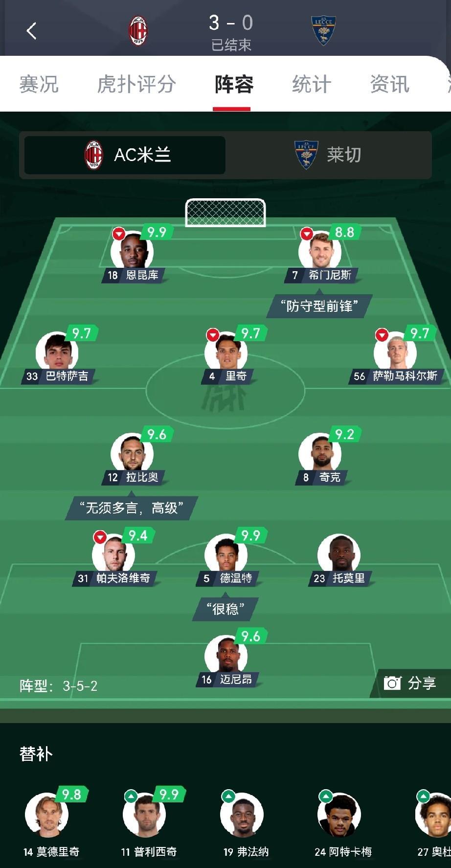 看来米兰今年要复兴了!这几场算是有点强队风范了!终于不像之前那样混日子了。 囧叔看来还是有两把刷子的,目前改革的非常不错。现在就看下场和领头羊那不勒斯的较量了。 不过有一说一,就从本场来看,里奇的表现还是不太行啊,根本就没有向前传球的能力。而当他下半场下场之后,米兰的中场到脚就少了,进攻也流畅起来了。 不过好在这是一场低消耗的比赛,省下体力周末对阵卫冕冠军才是真正的考验。