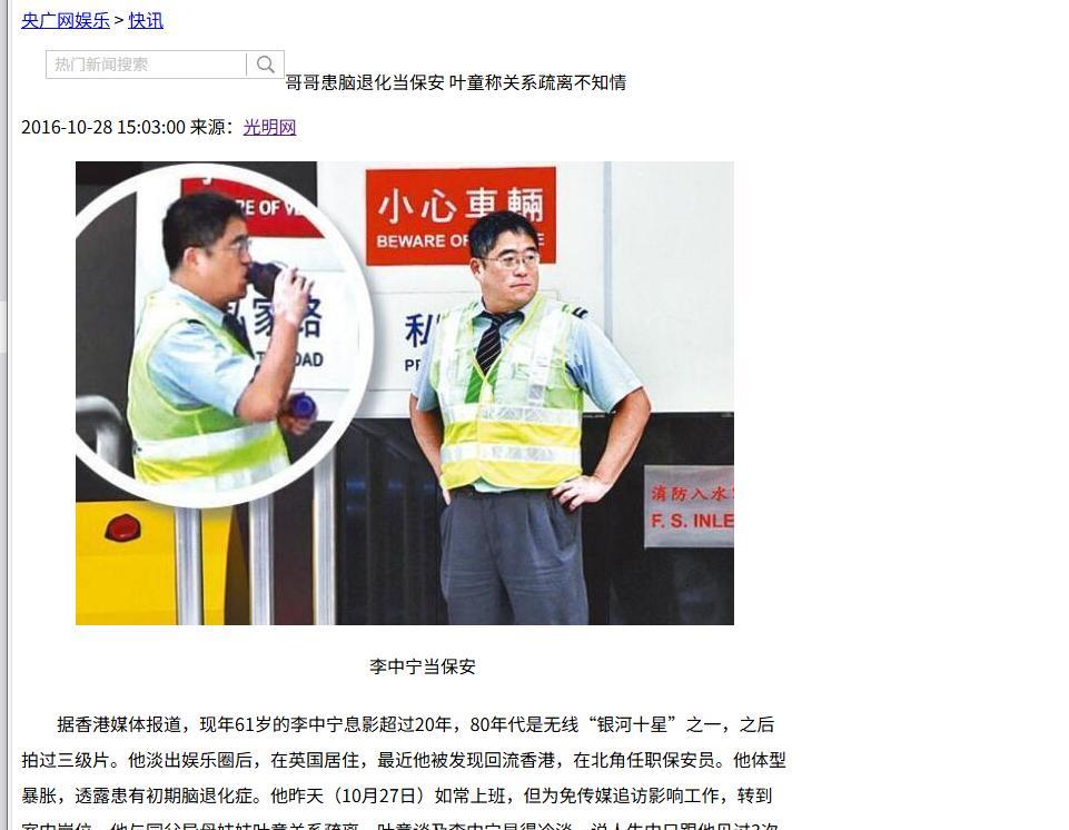 叶童回应亲哥哥李忠宁当保安。叶童说,我知道他现在在香港当保安,收入很低,但我不会去看他,更不会给他钱,因为父母从小就偏心。 ( 麻烦各位读者点一下右上角的“关注”,留下您的精彩评论与大家一同探讨,感谢您的强烈支持!) 叶童的名字早已家喻户晓。 她出道四十余年,至今仍活跃于荧幕之上,堪称常青树。 而鲜为人知的是,她有一位同父异母的兄长李中宁,也曾踏足演艺界,却走向了截然不同的人生轨迹。 这对血脉相连的兄妹,一生仅相见三次,关系疏离得如同陌路,其中缘由令人唏嘘。 李中宁生于1955年,童年时期便被送往英国求学。 在异国他乡的生活塑造了他独特的性格,也让他的成长轨迹与妹妹叶童截然不同。 直到三十而立之年,眼见妹妹在演艺圈风生水起,一事无成的他决定返港闯荡演艺圈。 然而年岁已长的他只能从最基础的临时演员做起,在各个片场奔波跑龙套,与当时已经崭露头角的妹妹形成鲜明对比。 那时的叶童年仅二十,却已凭借《表错七日情》荣获金像奖最佳女主角,成为炙手可热的新星。 令人意外的是,李中宁从未利用这层关系谋求便利,甚至在同事间也绝口不提与叶童的兄妹关系。 他凭借着高大挺拔的身材和俊朗的外形,最终获得无线电视的青睐,被推荐进入艺员训练班深造。 毕业后,他与郭富城、邱淑贞等同期学员被冠以"银河十星"的称号,一度前途光明。 因其微笑时与梁朝伟颇有几分神似,媒体给他冠以"大码版梁朝伟"的称号。 这个标签让他获得了更多关注,也赢得了无线高层的重视。 1988年,无线倾力打造豪华剧集《大都会》,李中宁有幸与郑少秋、汪明荃、梁朝伟、周星驰等当红艺人同台演出。 然而由于演技始终未能突破,他并未凭借这次机会一炮而红,反而逐渐沦为配角,在各类古装剧中饰演一些无关紧要的角色。 无线电视的薪资待遇本就有限,加之戏约减少,李中宁的经济状况日渐窘迫。 为维持生计,他最终不得不接拍风月片。 整个九十年代初期,他参演了二十余部此类影片,高强度的工作让他的身体每况愈下。 1995年,在参演完由吴启华和温兆伦主演的《信有明天》后,年届四十的他终于下定决心退出演艺圈,转而从商。 李中宁的性格如同其名一般忠厚老实,即便在风月片盛行的年代也几乎没有任何绯闻传出。 他选择餐饮行业作为新的起点,在香港经营一家火锅店。 然而香港餐饮业竞争激烈,他的首次创业以失败告终。 不甘心的他将目光投向曾经求学和生活过的英国,决心在那里开设中式火锅店。 可惜由于经营不善,这次创业不仅血本无归,还耗尽了他所有的积蓄,最终只能黯然返港。 在朋友的帮助下,李中宁得到了一份保安工作。 这份工作月薪约一万五千港元,远低于香港洗碗工的平均收入水平。 更让人唏嘘的是,他的工作地点与妹妹叶童的住所仅一街之隔,然而两人却从未有过联络。 2016年,李中宁被圈内熟人认出正在担任保安,随即引发媒体大规模报道。 面对媒体的追问,叶童回应称与这位哥哥一生仅见过三次面,语气平静却透露出难以逾越的疏离感。 据了解,叶童原名叫李思思,1963年出生于香港。 她的父亲从事外贸工作,早年带着李中宁和另一个女儿在国外生活,而叶童与母亲则被安置在香港,寄居在姨父家中。 这种特殊的家庭结构,让她的童年充满了寄人篱下的心酸。 叶童十七岁时为了谋生成为广告模特,在一次拍摄中被导演谭家明发掘,出演了首部电影《烈火青春》,与张国荣搭档演出。 事业稍有起色后,她特意飞往英国与哥哥姐姐见面,然而这次相聚并不愉快。 之后两人仅在父亲葬礼和叶童与陈国熹的婚礼上见过面,几乎没有任何交流。 如今,李中宁仍然从事保安工作,年近七十的他身体状况大不如前。 据媒体报道,他患有脑退化症,偶尔被拍到独自购买快餐,生活简单朴素。 他一生未婚未育,对于过往的演艺经历和与妹妹的关系,始终保持着沉默。 叶童则继续在影视圈发展,两人虽然生活在同一座城市,却再无交集。