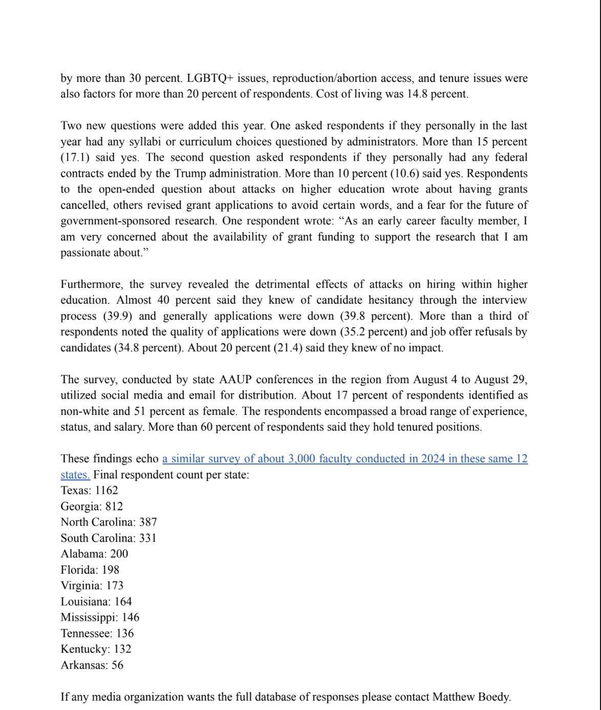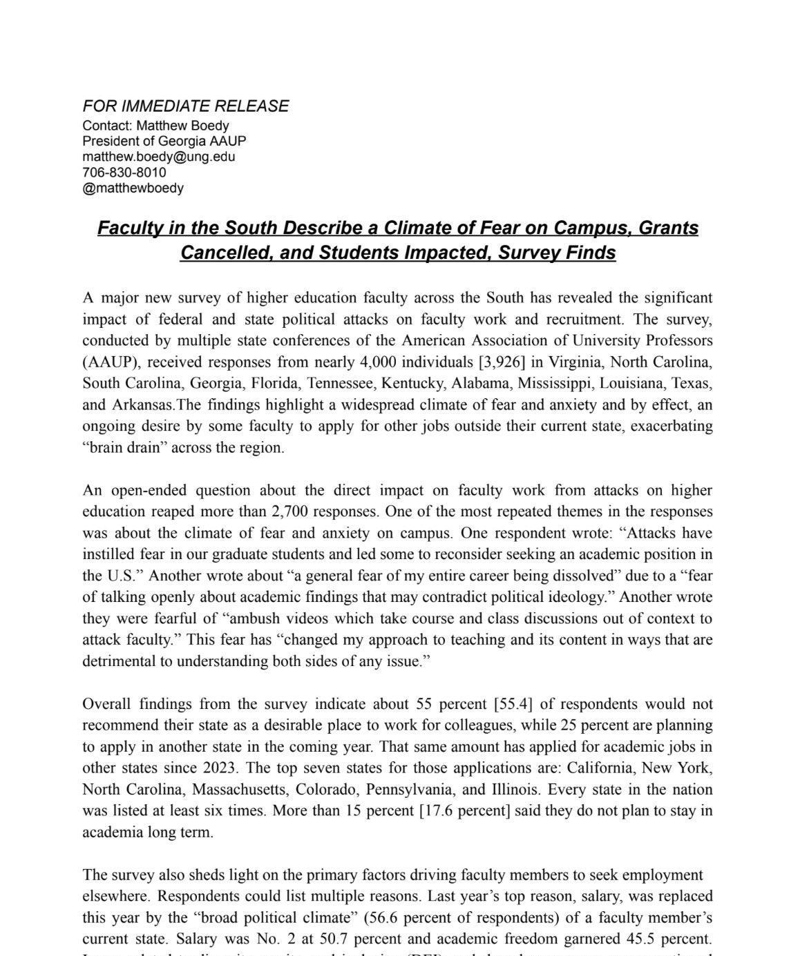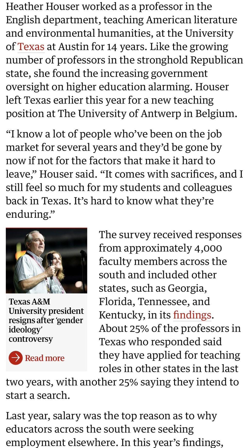 “恐惧与失望” 美国媒体对得克萨斯州、佛罗里达州等美国南方12个州的大学教授的调查,55%的教授不建议同行去他们的州,25%的教授计划明年申请去其他州工作。得州的大学教授现已有25%申请去其他州工作,还有25%计划开始申请。教授说对得州政府各种政策感到恐惧与失望。这些地方的教授最想去的州:加州、纽约、北卡、马萨诸塞、科罗拉多、宾州和伊利诺伊(全是蓝州,民主党派主导)