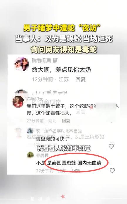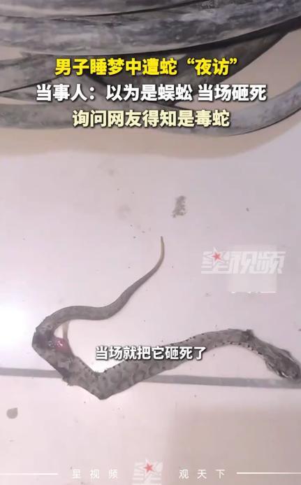 “太吓人了!”9月22日,江苏常州,一男子晚上睡觉时,突然感觉手臂凉凉的,就下意识甩了下手,男子起身查看后,发现地上有一只“大蜈蚣”,当场就给砸死了,开灯查看后才发现是条不认识的蛇。网友:是泰国圆斑蝰,国内无血清! 现在这个季节,正是蛇类活跃的时候,它们开始大量捕食,为几个月后的寒冬做准备,所以最近几个月,大家如果到户外的话,一定要注意防范,发现蛇后立即远离。 可有时蛇也会溜进人家里,这天晚上,黄先生已经进入了梦乡,可他突然感觉到手臂上一阵冰凉,于是就摔了一下胳膊,随后听到什么东西掉在地上了。 黄先生立即坐起身,睡眼朦胧的他看到地上有什么东西在爬,本以为是大蜈蚣,就直接给砸死了。 随后,黄先生打开灯查看,发现刚刚被自己砸死的是条蛇,而且还是没有见过的品种,由于不确定是不是毒蛇,他就拍了照片发到网上寻求网友的帮助。 有眼尖的网友认出,这是一条剧毒的圆斑蝰蛇,主要分布在东南亚地区,国内的话在两广和福建地区也能见到,但是江苏应该是没有的。 最关键的是,国内并没有专门的对付这种毒蛇的血清,所以一旦被咬伤,那可就危险了,不得不说黄先生真是命大啊。 那么问题来了,这蛇是怎么出现在江苏的呢? 信息来源:《男子睡梦中遭蛇“夜访”,当事人:以为是蜈蚣,当场砸死》星视频