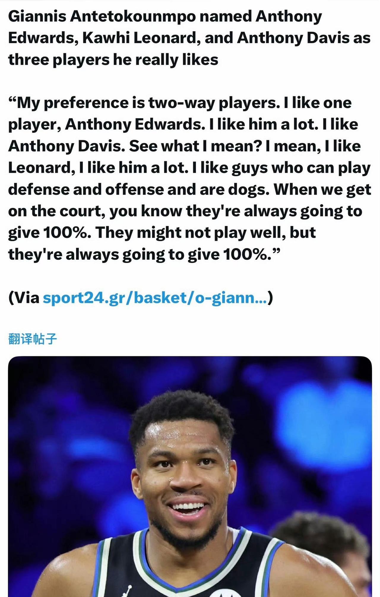 字母哥评当今五名最强球员:东契奇、约基奇、亚历山大、塔图姆和自己。 字母哥认为,