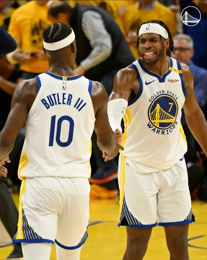 勇士官方更新X,晒出一组勇士球员吉米-巴特勒和巴迪-希尔德的赛场照与球迷分享。