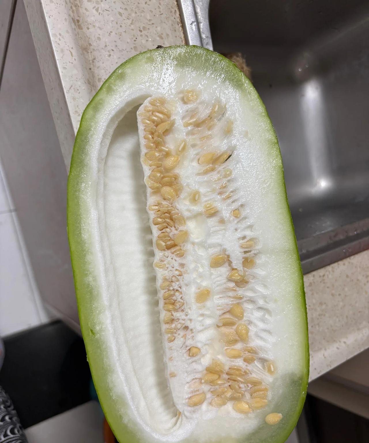 重庆一位网友太搞笑了! 他家住30楼,楼上邻居在阳台种菜,有一个西瓜刚好长在他们家阳台的上方,从一开始只有拇指大,慢慢长成了大瓜。 这个位置挡住了邻居的视线,估计都不知道这个果实的存在,他每天提心吊胆,这么搞得楼层,要是撑不住掉下去砸到人可不得了,但是擅自摘了又担心邻居说闲话。 好几次上楼想跟邻居沟通,不巧的是都不在家。 为了群众安全起见,最后还是决定摘了,本想着放在冰箱冰了再吃,切开后才发现里面是白色的,还有那么多瓤,不是西瓜啊? 那这又是什么瓜呢? #秋日生活打卡季#