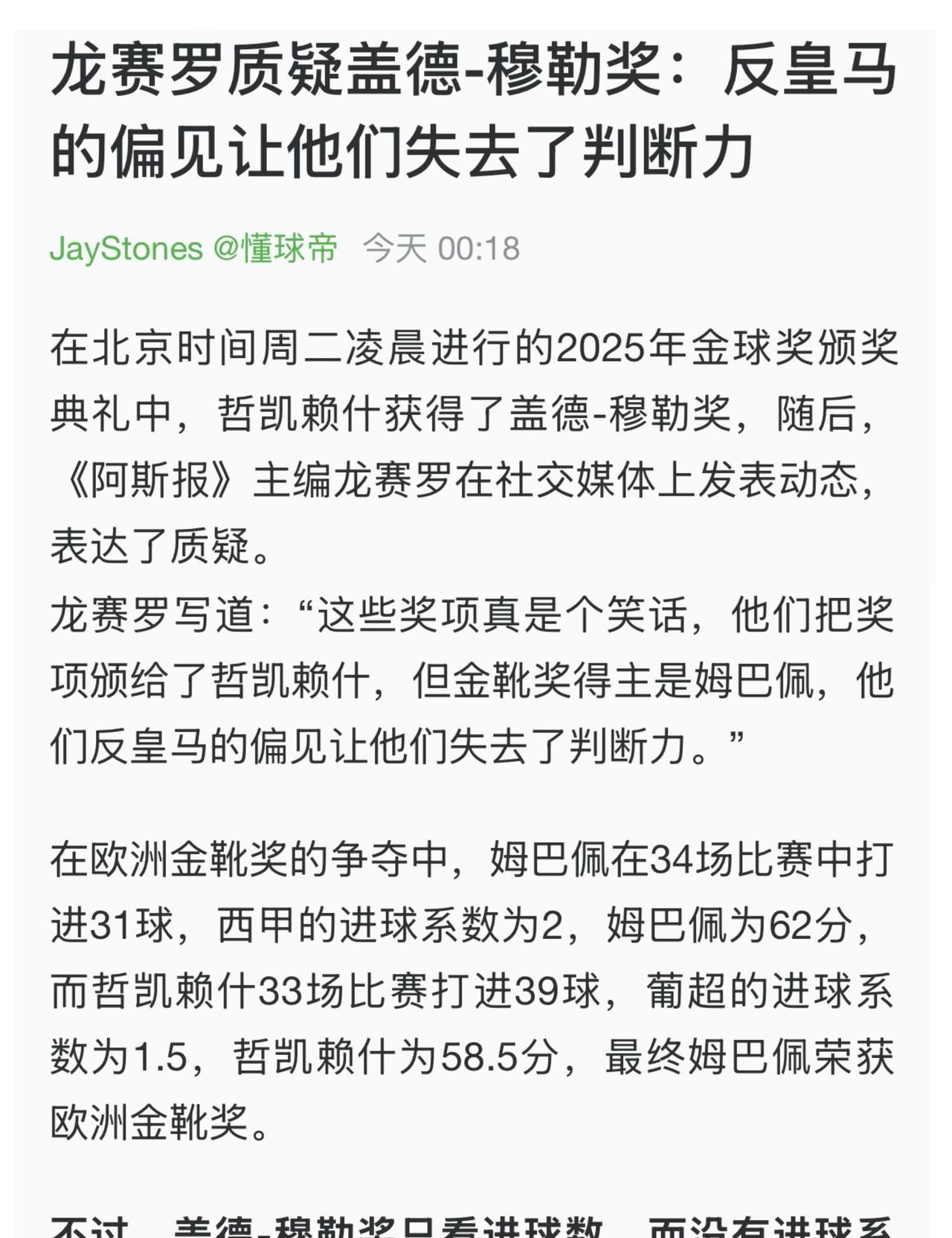 亚马尔他爹质疑登贝莱获金球奖,认为他儿子才应该得奖。 龙塞罗质疑哲凯赖什获穆勒奖