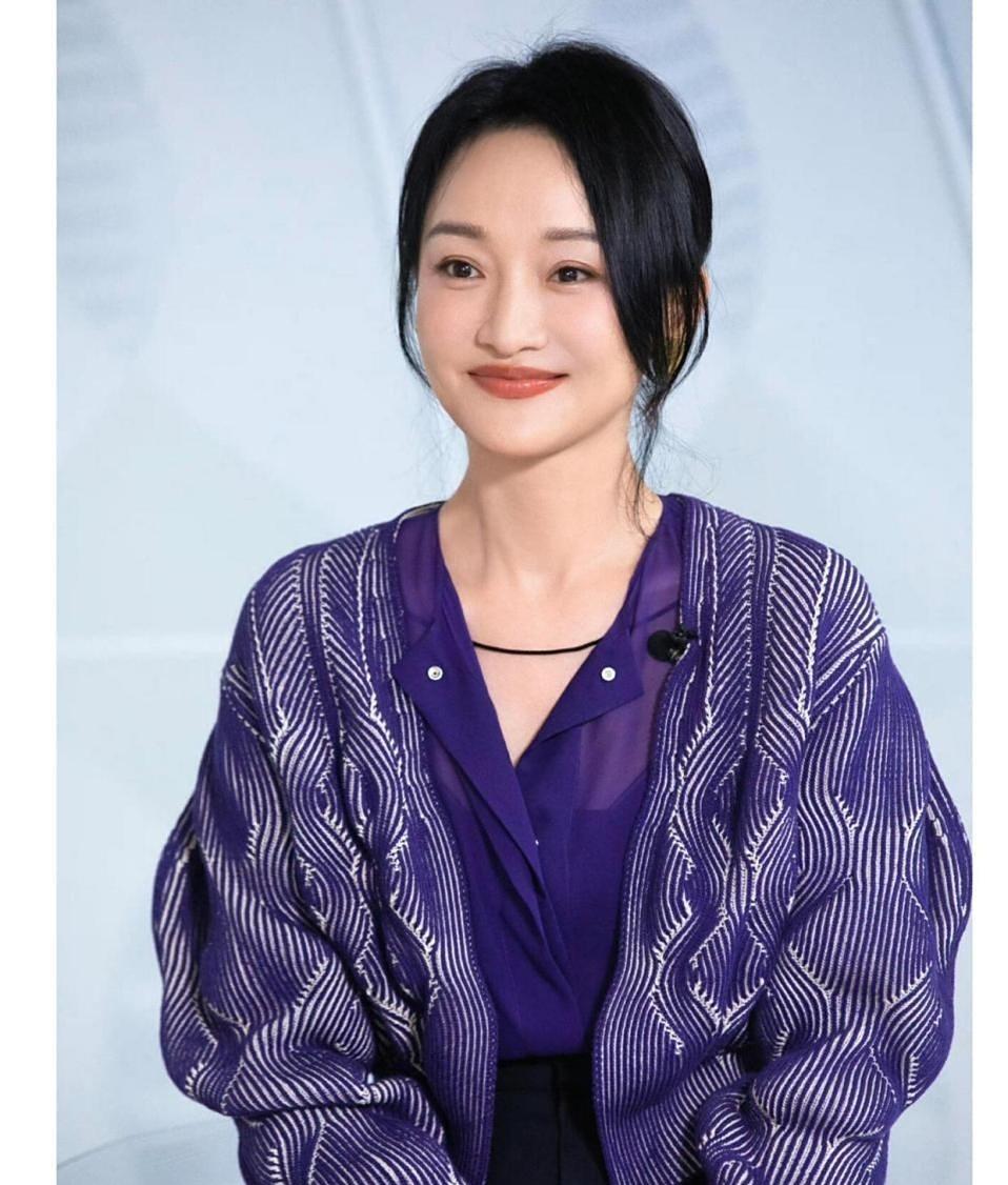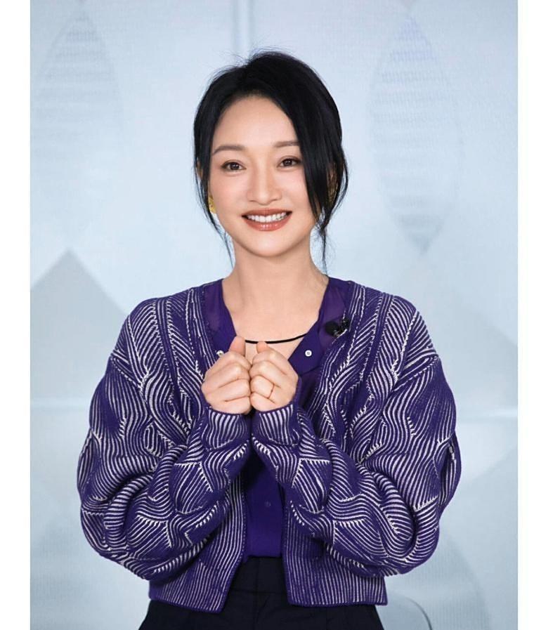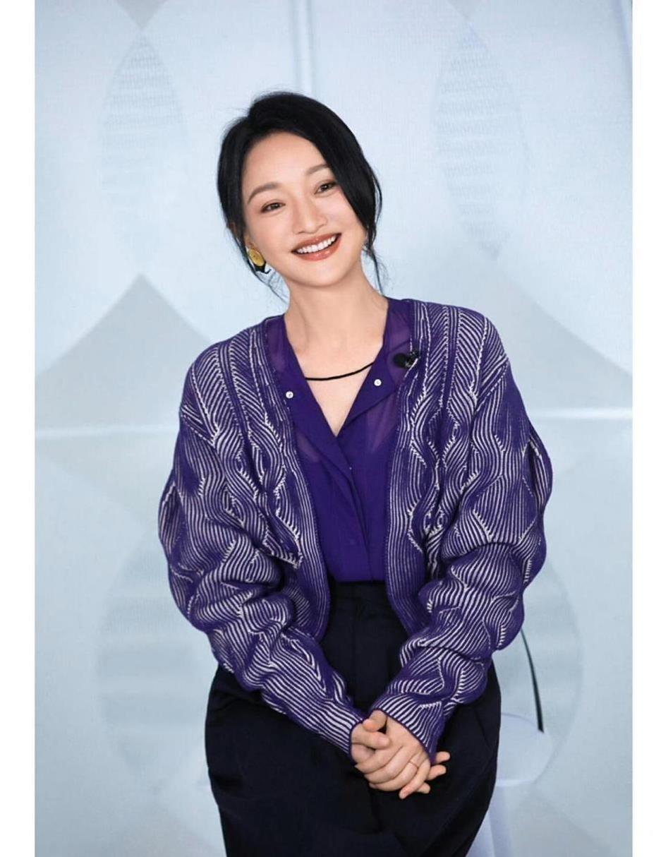 被50岁的“周迅”惊艳了!穿紫色开衫+高腰裤亮相