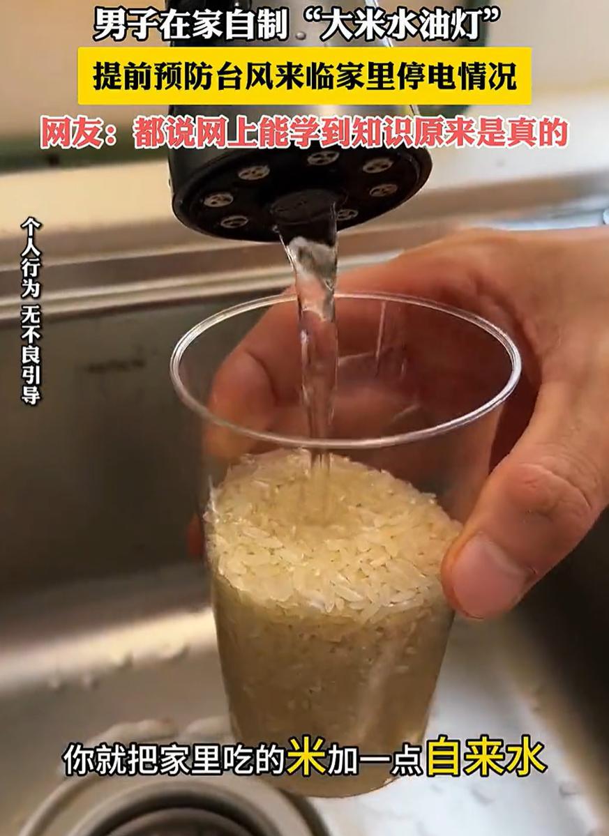 “网上是真能学到知识!”广东,一男子为预防台风停电,在家里用大米和水自制了一个油灯,没想到做好点着后效果还真的不错,网友:把它放东南角,如果灭了赶紧跑 男子介绍,他原本担心台风天万一停电,黑灯瞎火的不方便,就琢磨着自己搞个简易照明的东西,刚好刷短视频的时候,偶然看到一个教人用大米做油灯的法子,觉得挺有意思,就动手试了试 方法特别简单:找个杯子,先倒进去大半杯大米,然后加自来水,水量没过大米一点就行;接着再往水面上淋一层食用油,最后插一根棉签当灯芯,就这么几步,一个自制的小油灯居然真的亮起来了。火苗不大,但稳稳的 有网友说:直接用油和棉签不行?加水加米干啥?? 说起来,这种自制灯的原理不复杂,确实关键的东西就是油和棉签,但加水加米,恰恰是为了解决“直接用油和棉签”会遇到的几个麻烦 大米主要起固定棉签的作用,如果只用一杯油,棉签软塌塌的,很容易东倒西歪。一倒,灯芯碰到杯壁,要么把杯子烧炸,要么火苗熄灭,很不安全 而加水则是为了“省油”。火苗烧的是棉签上的油,而棉签的下半部分泡在水里。水就像一道屏障,阻止了整杯油被棉签持续不断地吸上去燃烧。如果全是油,棉签会像喝饮料一样猛吸油,火苗可能一时很旺,但一杯油很快就烧光了。加水后,燃烧速度变慢,能让这点油支撑更长时间 所以说这个土办法其实挺巧妙的。加水加米,目的就是让这盏小灯烧得更久、更稳、更安全,当然,绝大多数时间这都是用不上的,但知道这个方法备用也是不错的