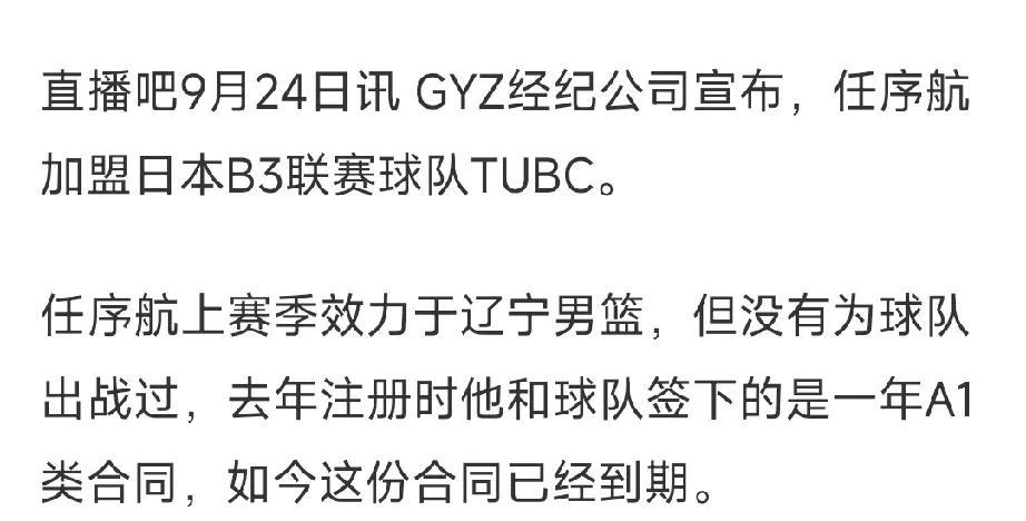 辽宁男篮小将加盟日本联赛! 辽宁男篮昔日年轻小将任旭航因为合同到期没有与球队续约,而且转向了日本联赛,毕竟上赛季在辽宁男篮一场没打,12人大名单也根本进不去,合同到期辽篮也没有与他续约。 据悉,任旭航加盟的是日本B3联赛球队TUBC,对于任旭航来说就是有上场机会,锻炼自己这样才有可能收到CBA球队的青睐和关注,实力提升了,自然就有机会回到CBA!