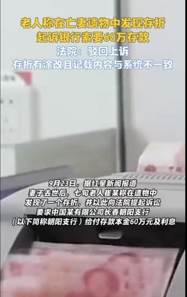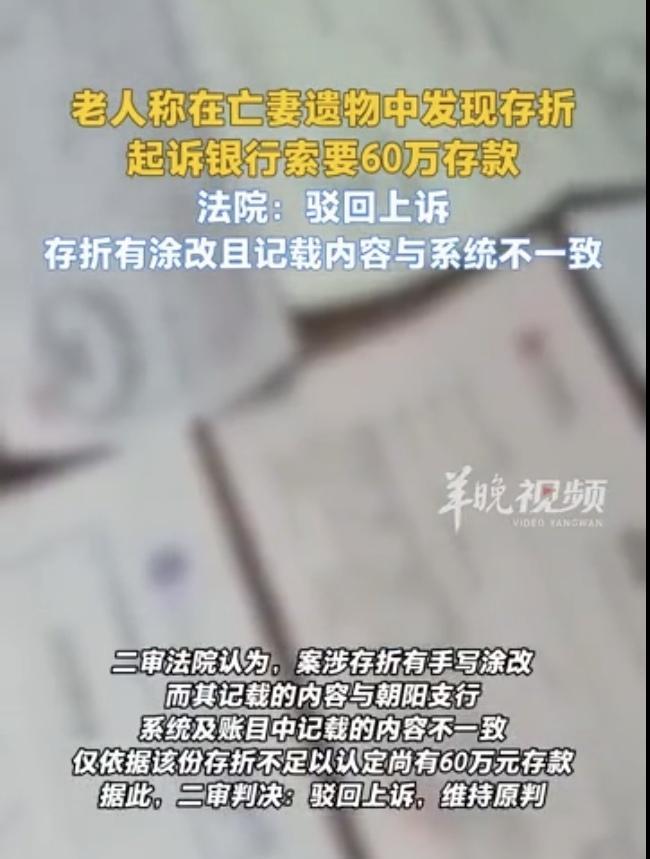 吉林长春,一70多岁大爷老伴病逝,他在老伴的遗物里,发现一张60万存折,他一下子想起来,20年前,他们存了100万,后来取出40万用了,卡里还剩60万,大爷乐颠颠去取钱,银行却说存折被涂改,存取款内容和银行系统不一致,认为存折造假,把大爷拒了,大爷急火攻心,直接把银行告上法庭,案子经过2审,最终的结果意想不到。 崔大爷古稀之年,本来精神矍铄,却因为老伴的离世,变得萎靡不振。 都说“少年夫妻老来伴”,这话不假,2022年3月8日妇女节,他相濡以沫多年的老伴撒手人寰。 没有了老伴的嘘寒问暖,热汤热饭,他觉得自己的世界都空荡荡冷飕飕了。 这天,崔大爷又想老伴了,他翻箱倒柜,整理老伴的遗物打发时间,以慰思念之情,可万万没想到,他竟然发现了一张以自己名字开户的60万存折。 崔大爷这才想起来,20年前,家里有100万的闲钱,老伴就自己拿着他的身份证,去某银行开了户,存进100万。 后来,因为家里用钱,他们又取出了40万,卡里还剩60万。 因为崔大爷是挣钱的耙子,老伴收钱的匣子,所以,平时家里理财存钱这样的事,都是老伴操心,时间久了,他就把这件事淡忘了。 没想到,整理老伴遗物,崔大爷才发现存折,这对他来说,就像意外之财一样惊喜,这60万,足够自己生养死葬了,也算给儿女减轻负担。 于是,崔大爷乐颠颠的拿着存折去取钱,可万万没想到,他的兑取,直接被银行拒绝了。 原来,银行发现,存折是真实的,但里面压根没有60万,这存折有伪造的嫌疑,疑点重重。 在银行系统里显示,这张卡是2000年6月6日开通的,但开通当日,只存进1元钱,并非100万,系统也不显示中间有支取40万的记录。 而奇怪的是,崔大爷手里的存折开户日期,却从6月6日,涂改成6月7日,既然没存入100万,怎么能支取40万,更谈不上剩余60万。 也就是说,崔大爷手里的存折是不是伪造的,但有涂改痕迹,记录内容和银行系统里的不符。 可崔大爷当然对银行的说法不服气,他认为银行系统出错了,或者,银行看他老伴不在了,纯粹是觉得死无对证,想不认账。 崔大爷还指望这60万养老呢,这下要愿望成空了,他岂能甘心? 崔大爷一纸诉状,把银行告上法庭,可案子经过2审最后的结果,让崔大爷无法接受。 不用多说什么,每个人都明白,你自己在银行能存入一百万,当时是什么经济状况,一查就清楚了。 这60万是否是一个普通人家的,当年这么多钱起码是大老扳才有的吧,一老百姓可能吗?当年有一万的都是万年户了也是极少数人才能有的,他怎么可能每100万取40万剩60万,不可疑吗? 也就是说就改了个日期6号改7号,其他都是机打的,存折有时候也能遇到银行手工改,而机打信息肯定是不会有问题的,还狡辩,这不是赖账嘛。 年纪大的老人最蠢的行为就是防儿防女不防贼!那么大年纪放些现金剩下交给儿女就得了,或改个联名存折,要考虑自己不便和过世难取的问题!很多老人干出来的事儿真是宁可便宜谁都行,也不能便宜给子女,那生孩子干嘛? 那么,法院会如何判决呢? 《民事诉讼法》第64条第1款规定:当事人对自己提出的主张,有责任提供证据。没有证据或者证据不足以证明当事人的事实主张的,由负有举证责任的当事人承担不利后果。 崔大爷主张其存折账户内有60万元存款未被支取,但仅提供了一张存在手写涂改的存折,开户日期从6月6日改为7日,而银行提供了系统内原始开户记录,账户开设于2000年6月6日,且仅存1元及完整交易流水,证明不存在其所述的100万元存入及40万元支取记录。 崔大爷作为原告需对“账户中存在60万元存款”承担举证责任。但存折中存款日期被涂改且无其他佐证如存单、取款凭证等,无法证明其主张的真实性。法院依法认定证据不足,驳回其请求。 《最高人民法院关于民事诉讼证据的若干规定》第90条规定:下列证据不能单独作为认定案件事实的依据:(三)存在无法解释的瑕疵的物证、书证。 崔大爷提供的存折存在“存款日期被涂改”的瑕疵,且与银行留存的系统记录矛盾,属于“存在无法解释的瑕疵的书证”,不能单独作为认定60万元存款存在的依据。 存折作为书证,其涂改痕迹直接导致证据可信度降低,崔大爷未补充其他证据,如存取款凭证、银行对账单等,仅凭存折无法形成完整证据链。法院据此维持原判符合法律规定。 法律要求主张权利的一方提供真实、完整、无瑕疵的证据,否则需承担败诉风险。 大额存取款应保留银行回执或电子记录,避免依赖单一存折;发现亲属遗留财产时,需通过合法途径核实并与生前资料,如遗嘱、账本交叉印证;夫妻共同财产可通过联名账户或公证文书明确权利归属,避免因一方离世引发纠纷。 法院一审驳回崔大爷的诉讼请求。大爷不服,提起上诉,二审法院维持原判。 信源:哈尔滨日报2025-9-23 关注@灋律盐究员 学法辩是非,用法止纷争。