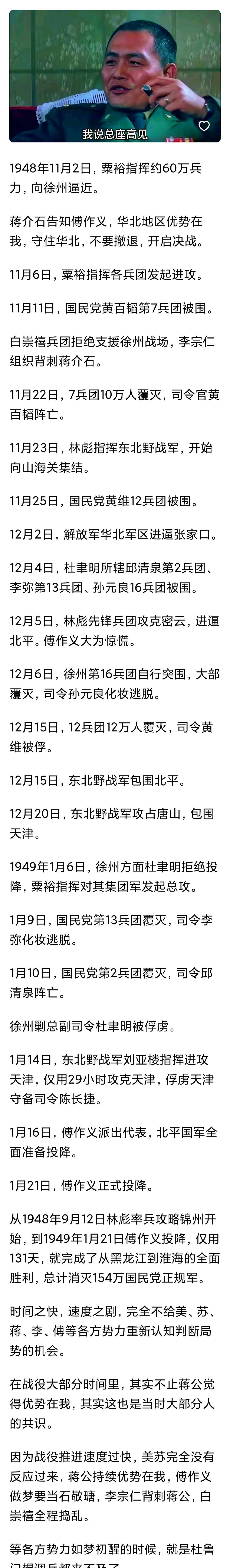解放战争为什么拖不得? 毛主席真是战略天才:在条件不成熟的时候积聚力量,待时机成熟迅速推进,这就是方法论。 所以,林彪不要休整了,极速入关! 解放战争拖不得,也是因为第一次柏林危机,这个同样是关键,当时美苏都讲主要精力放在欧洲,没有心思管中国。 毛主席再厉害,也不是神,三大战役前的实力对比,我们也比国军少近100万的兵力,不可能推测谁谁谁是菜鸡这么儿戏的。 其实这里已经看出,毛主席已经慢慢从国内政治家进化成立国际政治家,利用有利的国际窗口,彻底解决内战。要知道,当时就连苏联,也不支持我党统一中国。这种没朋友的背景下,打下江山,真的需要高明的政治头脑。 之后的对印自卫反击战也是,利用了古巴导弹危机这个窗口,在美国苏联甚至绝大多数国家支持印度的情况下,狠狠的揍了印度,实控阿克赛钦这个新藏关键路口。 天不生润之,万古如长夜。 老一辈革命家的雄才大略无人能比。
