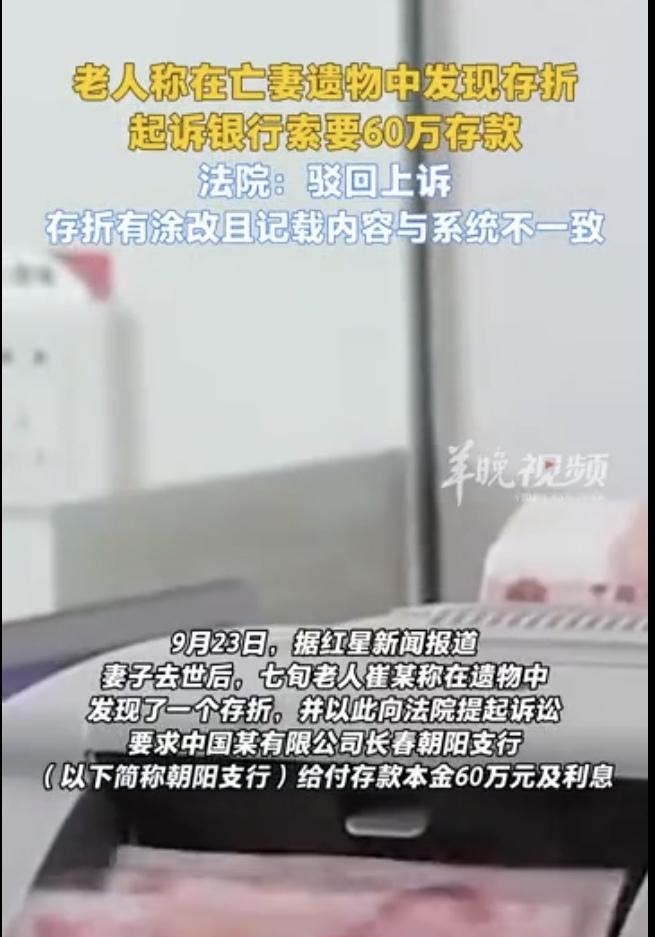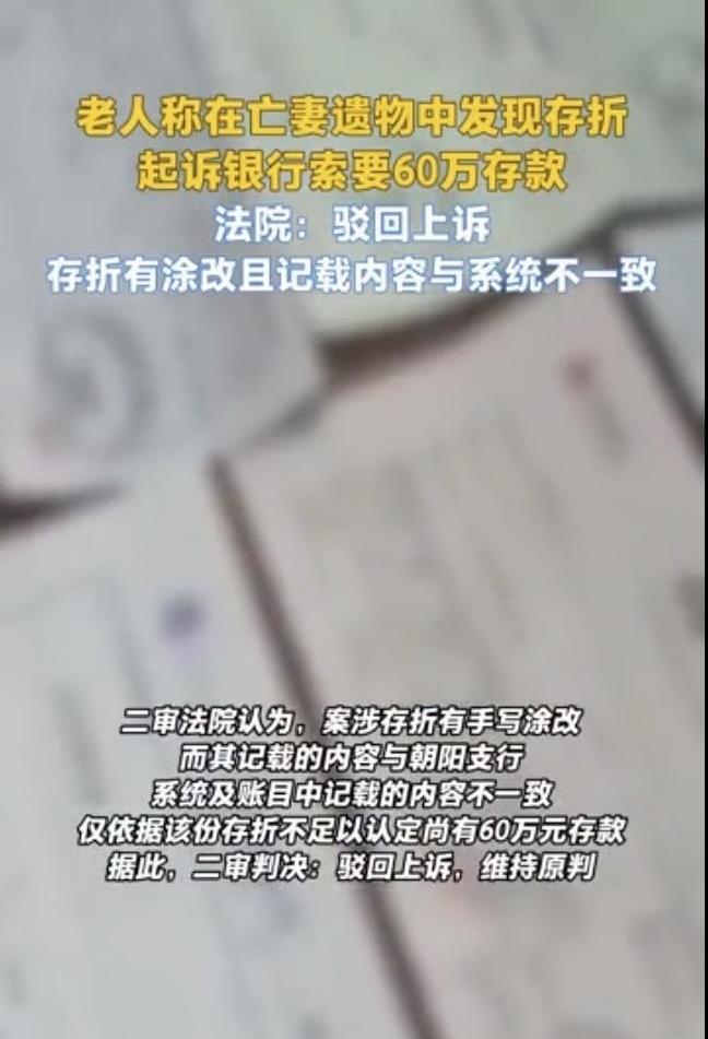 吉林长春,一70多岁大爷老伴病逝,他在老伴的遗物里,发现一张60万存折,他一下子想起来,20年前,他们存了100万,后来取出40万用了,卡里还剩60万,大爷乐颠颠去取钱,银行却说存折被涂改,存取款内容和银行系统不一致,认为存折造假,把大爷拒了,大爷急火攻心,直接把银行告上法庭,案子经过2审,最终的结果意想不到。 崔大爷古稀之年,本来精神矍铄,却因为老伴的离世,变得萎靡不振。 都说“少年夫妻老来伴”,这话不假,2022年3月8日妇女节,他相濡以沫多年的老伴撒手人寰。 没有了老伴的嘘寒问暖,热汤热饭,他觉得自己的世界都空荡荡冷飕飕了。 这天,崔大爷又想老伴了,他翻箱倒柜,整理老伴的遗物打发时间,以慰思念之情,可万万没想到,他竟然发现了一张以自己名字开户的60万存折。 崔大爷这才想起来,20年前,家里有100万的闲钱,老伴就自己拿着他的身份证,去某银行开了户,存进100万。 后来,因为家里用钱,他们又取出了40万,卡里还剩60万。 因为崔大爷是挣钱的耙子,老伴收钱的匣子,所以,平时家里理财存钱这样的事,都是老伴操心,时间久了,他就把这件事淡忘了。 没想到,整理老伴遗物,崔大爷才发现存折,这对他来说,就像意外之财一样惊喜,这60万,足够自己生养死葬了,也算给儿女减轻负担。 于是,崔大爷乐颠颠的拿着存折去取钱,可万万没想到,他的兑取,直接被银行拒绝了。 原来,银行发现,存折是真实的,但里面压根没有60万,这存折有伪造的嫌疑,疑点重重。 在银行系统里显示,这张卡是2000年6月6日开通的,但开通当日,只存进1元钱,并非100万,系统也不显示中间有支取40万的记录。 而奇怪的是,崔大爷手里的存折开户日期,却从6月6日,涂改成6月7日,既然没存入100万,怎么能支取40万,更谈不上剩余60万。 也就是说,崔大爷手里的存折是不是伪造的,但有涂改痕迹,记录内容和银行系统里的不符。 可崔大爷当然对银行的说法不服气,他认为银行系统出错了,或者,银行看他老伴不在了,纯粹是觉得死无对证,想不认账。 崔大爷还指望这60万养老呢,这下要愿望成空了,他岂能甘心? 崔大爷一纸诉状,把银行告上法庭,可案子经过2审最后的结果,让崔大爷无法接受。 不用多说什么,每个人都明白,你自己在银行能存入一百万,当时是什么经济状况,一查就清楚了。 这60万是否是一个普通人家的,当年这么多钱起码是大老扳才有的吧,一老百姓可能吗?当年有一万的都是万年户了也是极少数人才能有的,他怎么可能每100万取40万剩60万,不可疑吗? 也就是说就改了个日期6号改7号,其他都是机打的,存折有时候也能遇到银行手工改,而机打信息肯定是不会有问题的,还狡辩,这不是赖账嘛。 年纪大的老人最蠢的行为就是防儿防女不防贼!那么大年纪放些现金剩下交给儿女就得了,或改个联名存折,要考虑自己不便和过世难取的问题!很多老人干出来的事儿真是宁可便宜谁都行,也不能便宜给子女,那生孩子干嘛? 那么,法院会如何判决呢? 《民事诉讼法》第64条第1款规定:当事人对自己提出的主张,有责任提供证据。没有证据或者证据不足以证明当事人的事实主张的,由负有举证责任的当事人承担不利后果。 崔大爷主张其存折账户内有60万元存款未被支取,但仅提供了一张存在手写涂改的存折,开户日期从6月6日改为7日,而银行提供了系统内原始开户记录,账户开设于2000年6月6日,且仅存1元及完整交易流水,证明不存在其所述的100万元存入及40万元支取记录。 崔大爷作为原告需对“账户中存在60万元存款”承担举证责任。但存折中存款日期被涂改且无其他佐证如存单、取款凭证等,无法证明其主张的真实性。法院依法认定证据不足,驳回其请求。 《最高人民法院关于民事诉讼证据的若干规定》第90条规定:下列证据不能单独作为认定案件事实的依据:(三)存在无法解释的瑕疵的物证、书证。 崔大爷提供的存折存在“存款日期被涂改”的瑕疵,且与银行留存的系统记录矛盾,属于“存在无法解释的瑕疵的书证”,不能单独作为认定60万元存款存在的依据。 存折作为书证,其涂改痕迹直接导致证据可信度降低,崔大爷未补充其他证据,如存取款凭证、银行对账单等,仅凭存折无法形成完整证据链。法院据此维持原判符合法律规定。 法律要求主张权利的一方提供真实、完整、无瑕疵的证据,否则需承担败诉风险。 大额存取款应保留银行回执或电子记录,避免依赖单一存折;发现亲属遗留财产时,需通过合法途径核实并与生前资料,如遗嘱、账本交叉印证;夫妻共同财产可通过联名账户或公证文书明确权利归属,避免因一方离世引发纠纷。 法院一审驳回崔大爷的诉讼请求。大爷不服,提起上诉,二审法院维持原判。 信源:哈尔滨日报2025-9-23 关注@灋律盐究员 学法辩是非,用法止纷争。