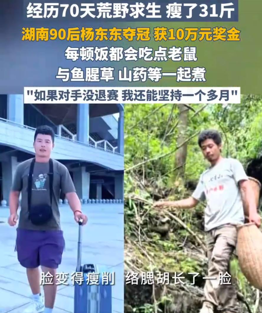 “这是个狠人!”湖南张家界,一男子去参加“荒野求生”的挑战,在经历了70天后,终于把最后一个对手给靠走获得10万的奖金,但这钱拿的却不轻松,用他的话来说,这些天几乎每顿饭都会吃点老鼠。网友:给我100万我都不会去参加 据悉,男子名叫杨东东,是一名90后,参赛前147斤,是个壮实小伙。70天后,站在人们面前的他,脸颊瘦削,眼神却格外清醒。体检报告显示,他的血糖、血压、脉搏一切正常,这让人惊讶 荒野求生不是光靠意志力就能撑下来的。杨东东有自己的一套方法。他说,一旦食物短缺,人就会焦虑。所以他从一开始就专注于解决吃的问题 他的日常饮食是野菜加荤食的组合:糯米藤、鱼腥草、山药,配上河里抓的螃蟹和鼠肉一起煮。蛋白质和维生素的合理搭配,或许正是他能在70天后保持健康指标正常的原因 有网友说:这个真的很难,要自己解决衣食住,还要自己拍摄。禁止伤害保护动物,禁止跟无关人员。最难解决的除了吃跟生活,还有孤独 确实如此,像荒野求生这种挑战,真要说最难的,其实就是孤独。啃点野菜,身体虽然难受,但总能熬过去。孤独是没法用食物来解决的。白天一个人面对荒山野岭,晚上只能听虫叫风声,没人说话,没人商量,这种空荡荡的感觉才最容易击垮人 杨东东能撑到最后,不光是会设陷阱、会熏螃蟹,更厉害的是他把孤独熬成了日常,把未知当成了挑战。他挺过去了,所以才有了最后的那10万奖金 很多人说,就算给100万也不去参加,这话不虚,因为绝大多数人都不能熬到最后
