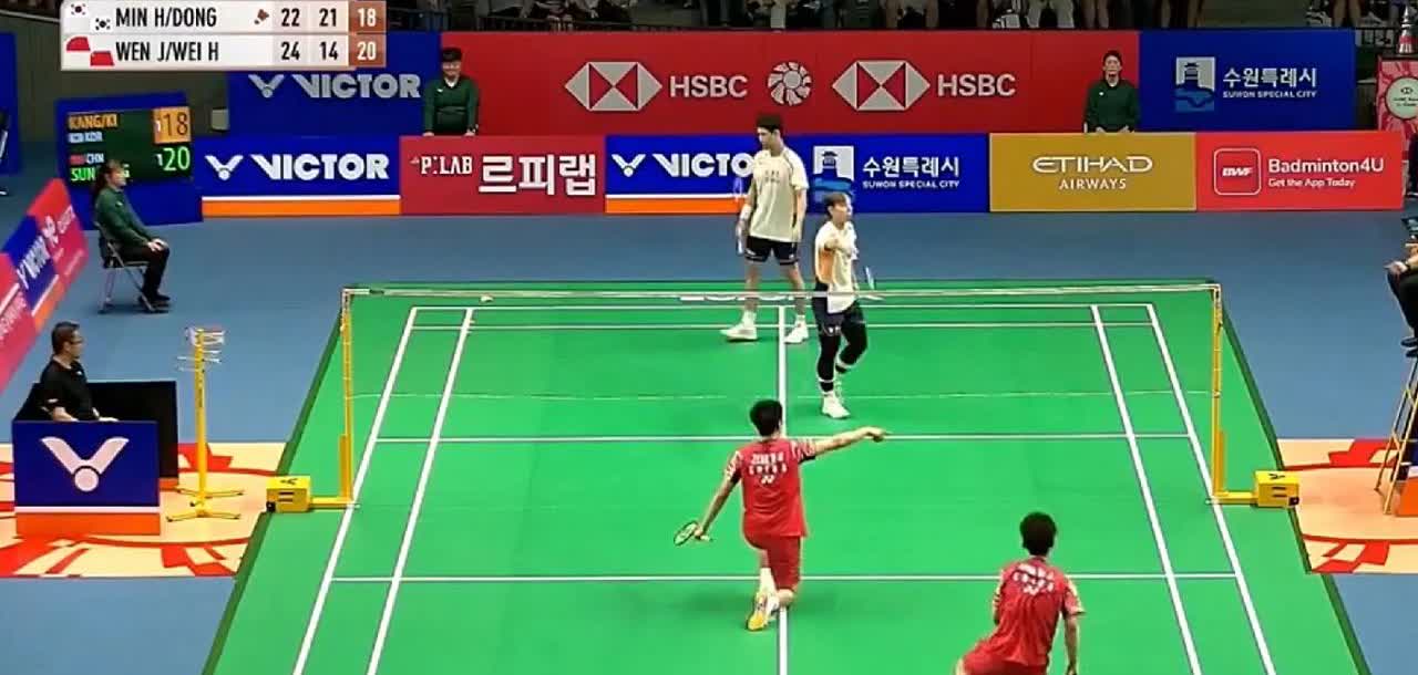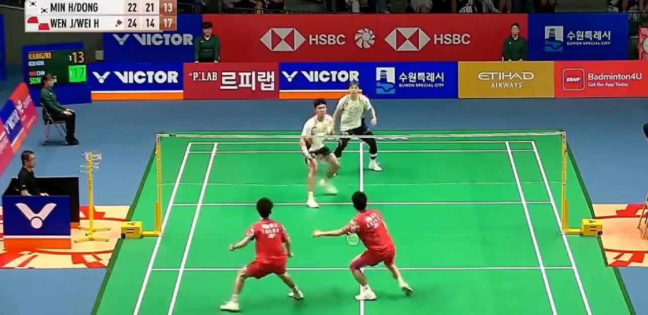 韩国羽毛球公开赛男双首轮,孙俊指导的公子赢球了!第三局,孙文骏/曾维瀚浪费两个赛
