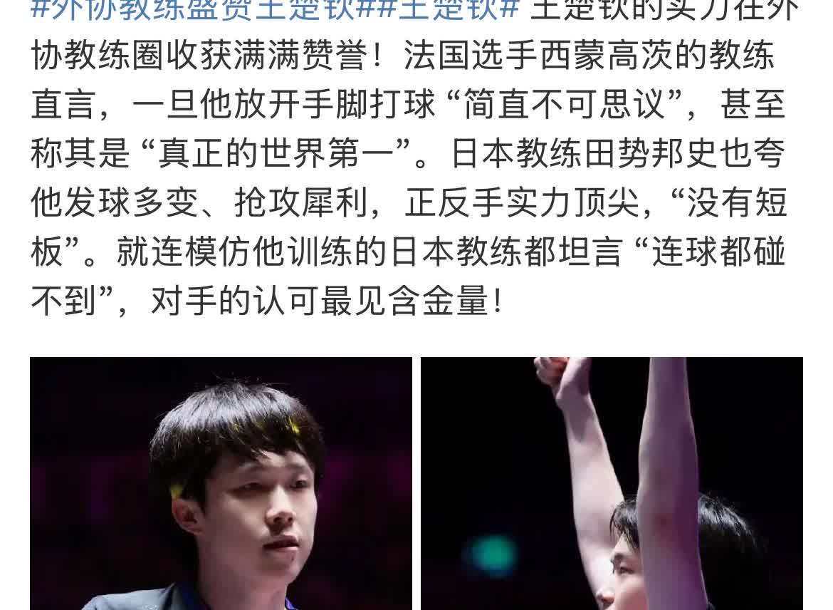 王皓教练已经很难了,请外协教练不要再觊觎王楚钦了[捂脸] 前🇦🇺主教练、现🇬🇧主教练被问到最想执教哪位现役球员时,他回答道:王楚钦。 John教练称赞楚钦身上有很强的风格和天赋,也非常喜欢他在球场上的表现,而在训练场上,楚钦就像个“怪物”一样,连续一个小时不停地进行正手三点训练,完全没有停歇,让人难以置信,双腿竟然能爆出那样的能量。即便在过去的一年里王楚钦经历过低谷,但现在已经重回巅峰,很真诚的祝贺他。 🇩🇪教练和🇮🇳教练在和王楚钦交谈时也满眼宠溺,笑的合不拢嘴。禁赛期,新加坡点名要他,以至于当时的刘国梁指导走到哪儿把他带到哪儿,生怕被人挖了墙角。 外协的盛赞楚钦技术全面、赛场风度以及逆境中表现出来的强大韧性,从波尔“顶级球员”的定位,到印度教练“白月光级欣赏”,再到Murphy“强大斗士”的形容,都证明了王楚钦已经在国际乒坛处于标杆地位。 可国内却一直质疑和诟病这位优秀的运动员,其居心叵测可以想见。