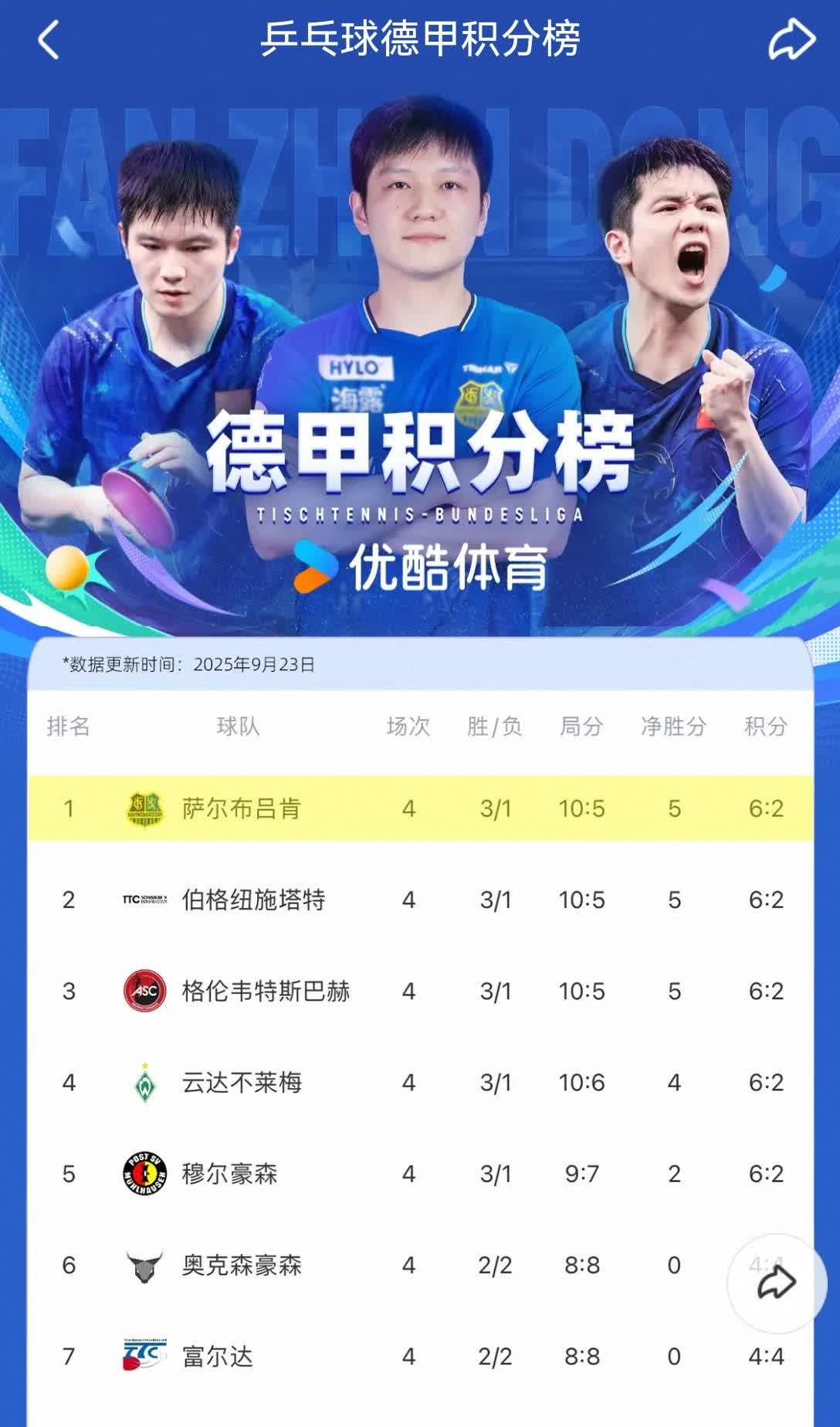 恭喜东哥的萨尔布吕肯队位居榜首啦 德甲第四轮过后,东哥所在的萨尔布吕肯俱乐部,以4战3胜1负,局分15局10胜5负,净胜分5分,积分6:2的战绩位列积分榜榜首。 东哥首轮出师不利,分别2:3不敌伊鲁斯和1:3不敌杜达。第二轮渐入佳境,分别3:1泽利科和3:1贝塔斯迈尔。第三轮19分钟3:0搞定沑汀克。东哥第四轮休战,但小弗队长2分进帐,与达科的1分,助队伍3:1获胜。 东哥加油,萨尔布吕肯队加油!
