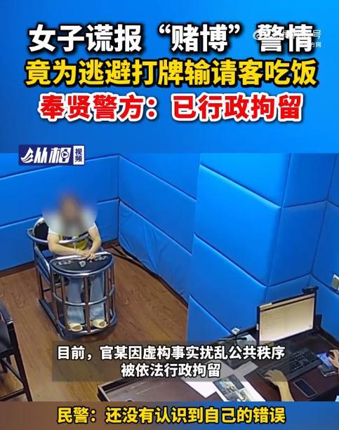 上海一女子跟3个闺蜜打牌,说好谁输了谁请客吃饭,女子输的最多,要花500请客。女子不愿意出,躲在厕所拨打110,举报有人“聚众赌博”…… 9月2日,上海奉贤警方接到了报警电话,说“有人聚众赌博”。 警方听后首先询问赌的是什么,被告知“打麻将”。 虽然麻将赌钱的话也属于赌博,但和赌场式的赌博还是不一样的。毕竟打牌、打麻将主要是为了娱乐和社交,钱财的输赢只是“彩头”,所以,只要金额不是很大,一般不认定为“赌博”。 因此警方又专门询问了多少人在打,打多少钱的,打了多少把? 被告知“一桌,一把20块钱,输赢四五千。” 这就触犯法律了,警方按照报警人的指引前往了某小区的住户。 敲门进入后,发现是四个女子在里面打麻将。询问她们是不是在“聚众赌博”,结果都不肯承认,说她们只是朋友间在玩,根本没有赌钱。 这和报警人说的不一样啊? 通过电话号,警方很快就找到了报警人。 果然是打麻将的女子之一官某。但她坚决不肯承认是自己报的警,说刚才手机在她老公那里,应该是她老公报的警。 然而,官某没想到的是,报警警方是有录音的,声音一对比,不是她还是谁? 警方对现场进行调查后发现,她们的确没有再赌钱,而是在“计分”,谁输的多,今天的晚饭就谁请。 这就有意思了,那报警人为什么报警说有人赌博呢? 官某就这么被警方带回了警局接受调查。 在警局之中,官某承认,那电话就是她打的,之所以要报警,是因为自己输的是最多的,想着将警察叫来,将她们驱散了,晚上的饭钱就不用出了。 毕竟,吃顿饭要500块钱呢! 虽然从官某一开始坚决不肯承认自己就是报警人,还想甩锅给她丈夫这件事,就能看出她可能有些……,但警方也没想到,这人竟然为了省500块钱报假警。 她都不考虑一下后果的吗? 就算警方“大事化小小事化了”,没追究报警人是谁就离开了,她们这朋友还能做得成吗?毕竟打麻将光她们四个知道,只要一核对就能找出来了。 警方专门问官某,知不知道她这是什么行为。 官某表示:“恐吓行为。” 一句话成功让警方无语,予以行拘。 很明显,官某就是在虚构事实,谎报警情,警方需要为了意见不存在的事情出警,浪费警力,落得个拘留也是应该。