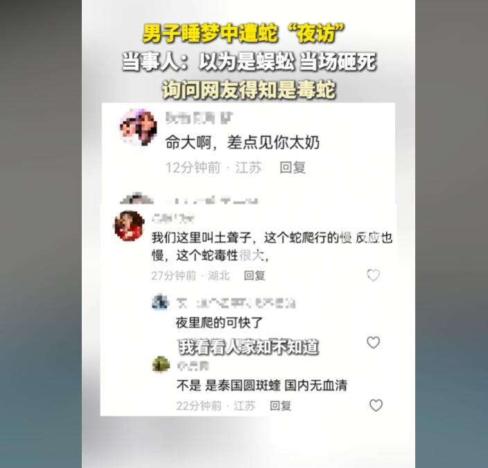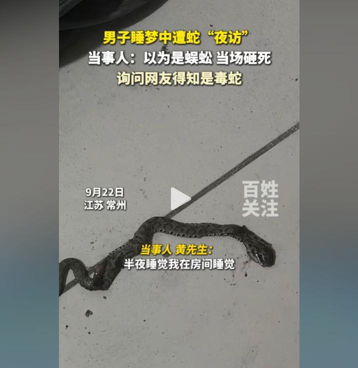 死里逃生!9月23日的江苏常州,一名男子晚上睡觉,在睡梦中猛然惊醒,突然感到身上凉飕飕的,睁开眼睛看到,竟然是一条蛇,被吓到了。 主要信源:大象新闻9月23日报道 江苏常州有位男士,某天在家休息的时候,手上突然传来一阵凉飕飕的感觉。 他当时没太在意,以为是蜈蚣爬过去了,顺手就往旁边甩了一下。 可甩完之后,他总觉得不对劲儿。 那触感不像蜈蚣的细腿,反而滑溜溜的,带着点韧劲。 他心里犯起嘀咕,赶紧起身去开灯,想看看到底是什么东西。 灯一亮,他当场就愣住了,后背瞬间冒了汗,刚才爬过他手的,哪是什么蜈蚣啊,分明是一条蛇! 那条蛇就在他刚才坐的椅子旁边,还在慢慢蠕动。 他来不及多想,赶紧在屋里找了根木棍,小心翼翼地凑过去,几下把蛇打死了。 等蛇不动了,他才松了口气,可越想越后怕。 毕竟是在家里出现蛇,万一刚才没甩开,被蛇咬到了可怎么办? 他拿起手机,把蛇的照片拍了下来,发到网上,想请网友帮忙看看,这到底是什么蛇,有没有毒。 他本来以为就是条普通的家蛇,结果网友的回复让他又惊出一身冷汗。 好多网友说,这条蛇是圆斑蝰,是有毒的蛇,而且毒性特别强。 要是刚才被它咬到,没及时治疗,后果根本不敢想。 大家都觉得他运气好,能平平安安把蛇处理掉,没出什么事。 这圆斑蝰长得有特点,认起来不算难。 它的头特别大,是那种很明显的三角形,跟脖子的界限分得清清楚楚,一眼就能看出来。 最特别的是它的鼻孔,不长在鼻子前面,反而长在头顶上,正好卡在三片小鳞片中间,这模样跟别的蛇不太一样。 而且它的眼睛和鼻孔之间、眼睛和嘴唇之间,都隔着两排细细的小鳞片,这也是认它的一个重要地方。 圆斑蝰的身体长得粗粗的,身上覆盖着的鳞片不是光滑的,而是带着点棱角,摸起来可能会硌手。 它的后背是灰棕色的,上面排着三排圆形的斑纹,一般有二十四到三十一个。 正中间那一排圆斑最大,大概有二十九个,跟两边的斑纹错开排列着,看着很有规律。 每个圆斑的中间是紫褐色的,外面围着一圈黑边,最外圈还有一道黄白色的边,颜色对比很明显,看着特别醒目,想认错都难。 这蛇最危险的地方,就是它的毒牙。 它长着一对中空的毒牙,像小管子似的,咬到东西的时候,会把毒液注射进去。 虽然它没有能感知热量的颊窝,但毒性一点都不弱,被咬到之后,身体会很快出现反应。 另外,它的头背面有三个深棕色的斑纹,排在一起像个“品”字,这也是分辨它的一个办法。 圆斑蝰平时爬得慢悠悠的,看着没什么威胁,可一旦要攻击,速度快得让人反应不过来。 它会先把前半身往后弯,像拉弓一样攒着力气,然后猛地弹出去咬目标。 最吓人的是,它只要咬住东西,就死活不松口,非得咬够了才放。 小的圆斑蝰更厉害,受了惊吓之后,会把身体一会儿鼓起来、一会儿缩回去,同时发出“呼呼”的声音,那声音听着就吓人,而且这种状态能持续好几分钟,有时候甚至能到半个钟头。 天热的时候,圆斑蝰喜欢躲在凉快的地方,比如树荫下、墙角边,或者石头缝里,就怕被太阳晒着。 到了秋天,地里的庄稼该收割的时候,它就会跑到稻田里活动,可能是想找老鼠或者虫子吃。 所以每年的9月、10月,被这种蛇咬到的人特别多,像广州、福建泉州那边,因为气候合适,这种情况更常见。 要是真遇到圆斑蝰,或者其他不认识的蛇,最要紧的是保持冷静,别慌慌张张的。 站在原地别动,别往蛇的跟前凑,更别想着自己拿棍子打或者用手抓它,那样很容易被蛇攻击。 应该赶紧联系专业的人来处理,比如打消防电话,或者找懂蛇的人帮忙。 平时在家的时候,也得注意居家安全。 多看看房子周围有没有杂草堆、乱石堆,这些地方容易藏蛇,及时清理干净。 门窗也要检查好,看看有没有缝隙,别让蛇从缝隙里爬进家里来。 生活里难免会遇到这种意外情况,不用太害怕。 只要多了解点这方面的知识,知道遇到蛇该怎么应对,遇事不慌,按正确的办法处理,就能保护好自己,也能跟自然界的这些小动物和平相处。