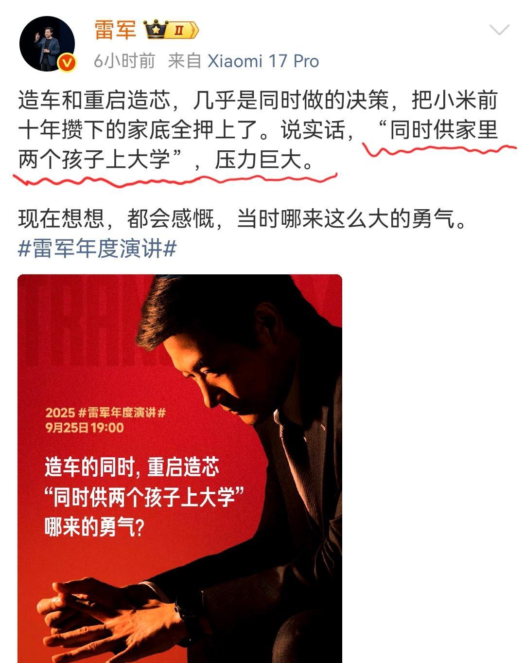 雷总说:同时供家里两个孩子上大学,压力巨大。 谁听了不吓一跳啊,世界500强的企