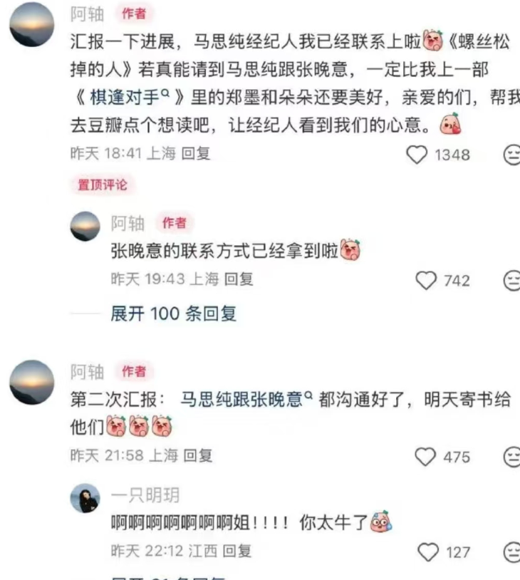目前作者已经联系上马思纯和张晚意了,准备给他们寄书了,这也是观众自发嗑cp的效应奏效了。