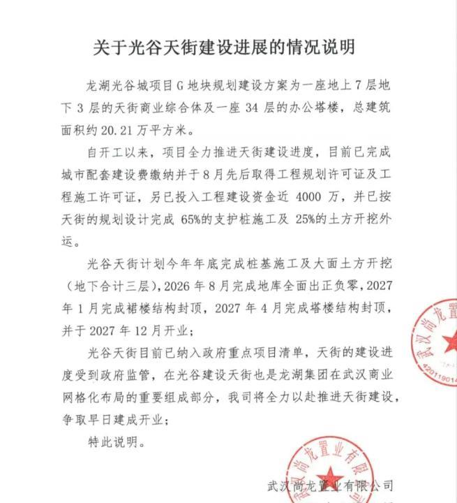 武汉城事! 近日,有网友咨询称:龙湖光谷天街啥进展,最近没有看到工人施工! 对此