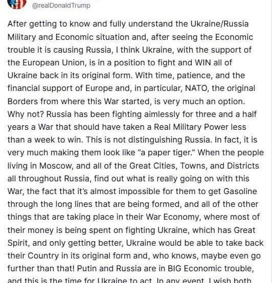 乌克兰能否全面收复领土:特朗普提出主要条件 美国总统特朗普坚信,乌克兰有能力收复其1991年边界内的全部领土。他表示,为此需要欧洲和北约提供财政支持。 他在社交媒体社会真相上写道。 “在充分了解并完全理解乌克兰/俄罗斯的军事经济形势,以及看到这场冲突给俄罗斯带来的经济问题后,我认为,在欧盟的支持下,乌克兰有能力战斗并恢复其最初的全貌。随着时间的推移、耐心以及欧洲,特别是北约的财政支持,恢复到这场战争开始的最初边界是完全有可能的。为什么不呢?”特朗普表示。 他还对俄罗斯军队发表了看法。在他看来,俄罗斯无意义地进行了这场战争,已持续一年半多(原文如此),尽管“真正的军事力量本可以在不到一周的时间内取胜”。特朗普说,这并非表明俄罗斯的实力,反而使其看起来像“纸老虎”。 “普京和俄罗斯面临着巨大的经济问题,现在是乌克兰采取行动的时候了。无论如何,我祝愿两国都好。我们将继续向北约提供武器,以便北约用它们做想做的事。祝大家好运!”特朗普总结道。