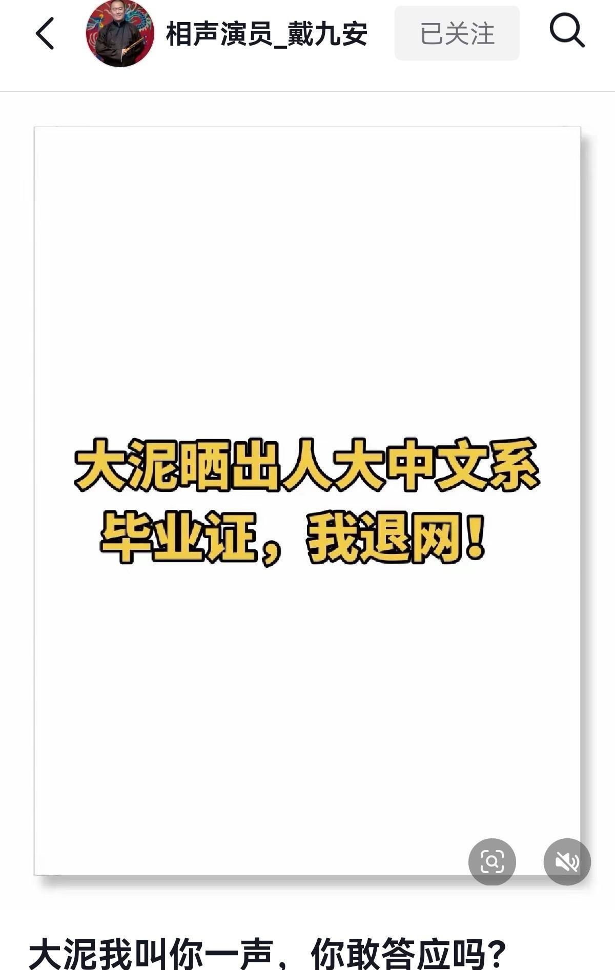 #秋日生活打卡季# 戴九安,硬刚郑好:晒出人大中文系毕业证,我就退网。 戴九安,原来是德云社的相声演员,现在是曲艺赛道的一个主播。 郑好,是德云社的相声演员,也是曲艺赛道的头部主播。 戴九安和郑好是冤家对头,他经常在直播间讽刺、挖苦郑好,还拿郑好的直播切片,对口型演双簧。 郑好说自己是人大中文系的毕业生,现在是两所大学的客座教授。 但令人遗憾的是,郑好却经常在直播间读错别字,让人不得不怀疑他文凭的真实性。 戴九安刚刚发了一条视频,标题为:《大泥我叫你一声,你敢答应吗?》 视频很简单,只是一张图片:一张白纸上面写了两行大字: “大泥晒出人大中文系毕业证,我退网!” @兰石读书习字 :作为一个主播,戴九安非常清楚退网意味着什么。 戴九安之所以敢这样硬刚郑好,是不是有十足的把握? 郑好会如何回应戴九安?我们只能拭目以待了。
