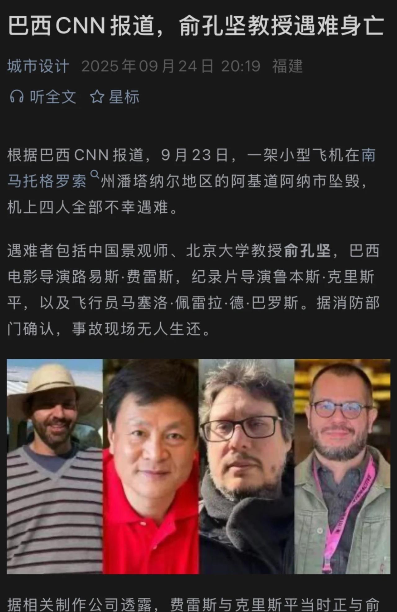 天哪!北大教授俞孔坚在巴西遭遇空难不幸遇难,事发之际俞孔坚教授乘坐的是四人位的小
