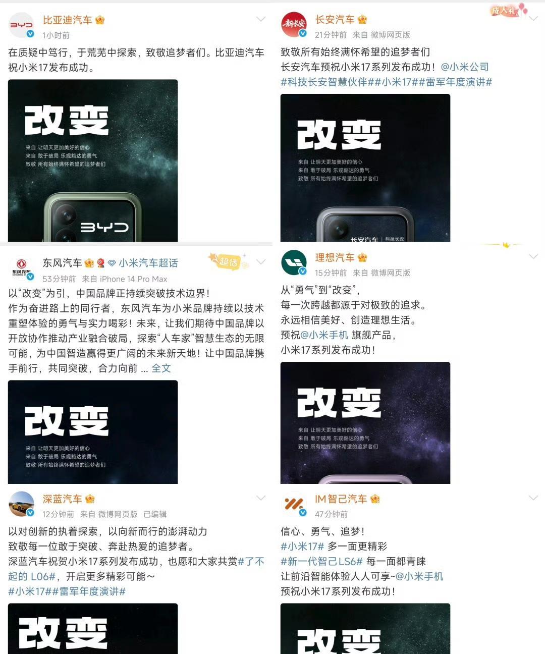 顶级品牌互相致敬[赞] 比亚迪、理想、东风等车企发文预祝小米17发布会成功举行! 老辣今天又看到了国内企业的友好互动,值得点赞![赞][赞] 在一起才是中国企业! [吃瓜群众]那个,天猫、顺丰、元气森林和京东咋回事,人家车企团建咋还有其他类目的品牌混进来了。 还有不到一天的时间,小米17系列就要正式发布了。 估计还会有更多友好品牌发文祝贺,值得点赞[赞]