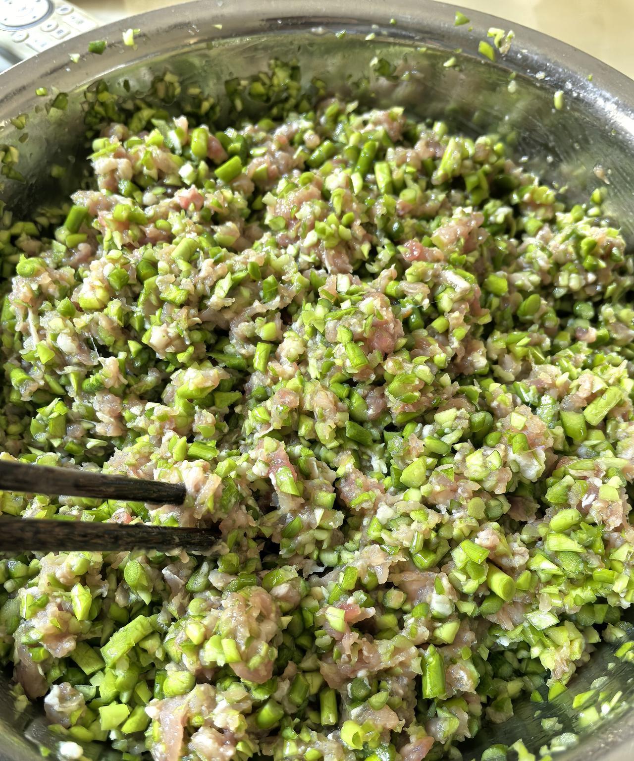 #晒出我的今日美食#今天包了一顿蒜苔肉饺子,格外的好吃,不但好吃,而且好包。 蒜苔比起其他包饺子常用的菜,比如韭菜、茴香、白菜等,有很多优点:好择、好洗、不用挤水、而且包的过程中也不会出水,还特别出馅,加盐了也不抽抽,一家三口,好歹买一把就够吃。 调馅也特别简单,由于蒜苔本身味就比较重,所以不需要加其他调料调味,也不用调色。油烧热,冷却一下,加入肉搅拌均匀后,再加入蒜苔、盐、香油拌匀即可,属于有手就会的难度级别。 没有包过的可以尝试一下,绝对不会翻车。