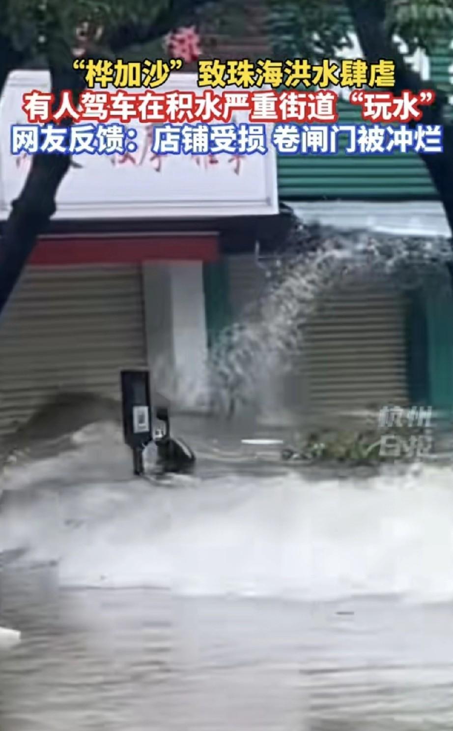 珠海某街道遭受“桦加沙”台风影响,洪水泛滥涌上街道。然而,竟有人驾车在积水严重的街道上“玩水”。街道两旁店铺的卷帘门被湍急水流冲烂,有路人试图拦下车主,可车主丝毫没有停车之意,继续驱车向前,迅速驶离现场。 这种把自己的快乐建立在他人痛苦之上的行径,实在可耻!此人开车毫无素质,心肠歹毒、行为缺德。街道本就因台风遭受了巨大损失,他还如此胡作非为。整条街的损失理应由他赔偿,建议整条街的商户抱团起诉他。造成财物损失就该赔偿,若故意为之且损失金额达到标准,那就让他去坐牢。