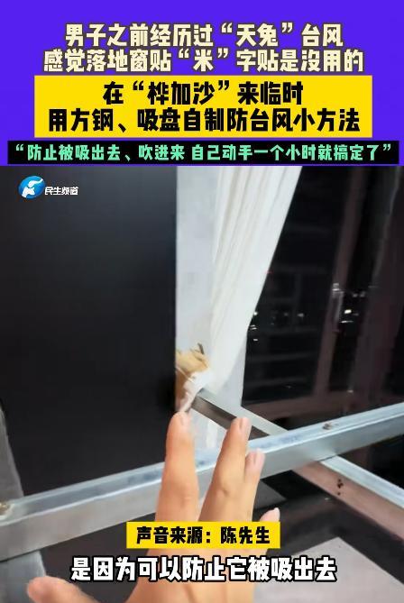 “人怎么可以这么聪明?”广东一男子为了应对台风“桦加沙”,家住15楼的他,竟然买了一堆方钢、玻璃吸盘,自己组装防台风,可以防止把玻璃给吹进来,玻璃吸盘可以防止它被吸出去,方刚加螺丝,比那些贴胶布,贴米字贴的好多了。 9月24日,河南广播电台发布的一则视频,引发了大家的讨论。 眼看台风步步逼近,广州的街头巷尾顿时弥漫着紧张的气息。 居民们忙得焦头烂额的,有的忙着囤积粮食、矿泉水、方便面以及应急药品,生怕断水断电时生活受影响; 有的赶紧检查门窗,贴上防风膜、加固窗框,甚至用木板钉住阳台,生怕狂风将家中物品掀翻;还有的开始关注避难所的开放信息,提前规划好撤离路线,确保一旦情况紧急能快速撤离。 小区物业也加紧行动,工作人员检查排水系统,清理下水道的杂物,以防暴雨导致积水严重。街边的商铺纷纷拉下铁卷门,临时加固橱窗玻璃,防止被风雨破坏。 甚至连平时闲散的街坊邻居也都自发行动起来,互相提醒检查家里的安全设施,帮忙搬动易被吹走的物品到安全地方。 这位经历过大台风的大哥早就明白,仅仅在玻璃上粘米字胶带根本起不了什么作用,风一吹,胶带根本承受不住,就算能挡住碎片,也无法真正保障安全。 于是,他决定自己动手,打造一套真正可靠的防御系统,他先去建材市场买来一堆方钢和玻璃吸盘,又配齐了螺丝、固定支架等材料。 回到家后,他先用方钢搭建出一个框架,确保每块玻璃都能被牢牢“包围”;再把玻璃吸盘固定在框架上,每个吸盘都紧贴玻璃表面,以防狂风把玻璃吸出或吹碎。 每一根方钢都用螺丝仔细固定,整体结构看上去结实而稳固,几乎像是给窗户加上了一层隐形的“防护盾”。 组装完成后,他反复检查每个连接点的牢固程度,又试着轻轻摇晃窗户,确保风一来不会有任何松动。 大哥心里踏实多了,他甚至笑着说:“以后台风来了,再也不用担心玻璃飞进屋里砸人了。” 他的邻居看到这套“自制防台风装置”都惊叹不已,有的还悄悄学着他的方法,也开始加固自家窗户。 大哥的做法不仅保障了自己家人的安全,也在社区里起了示范作用,让大家意识到,面对台风,科学防护才是真正的安全保障,而不是简单的米字胶带应付。 有人说:实际不怕风,就怕吹起来的异物。 信息来源:河南广播电视台
