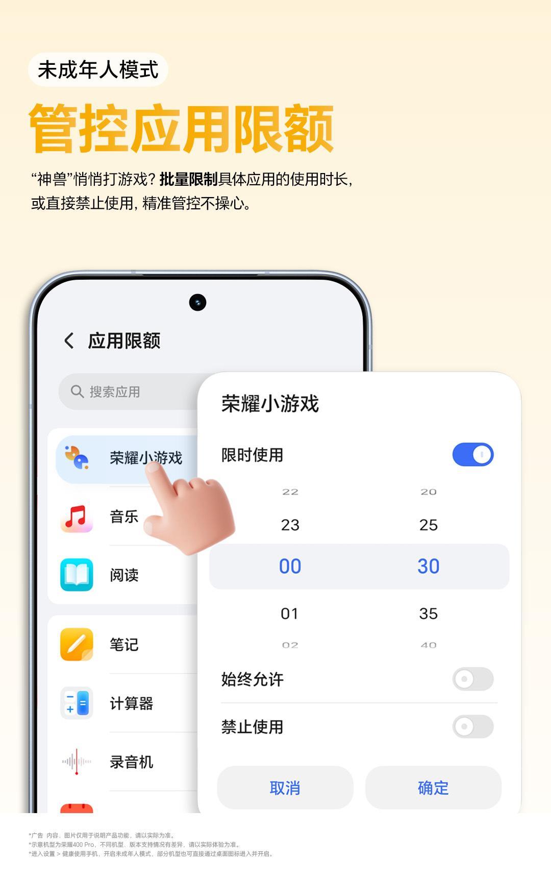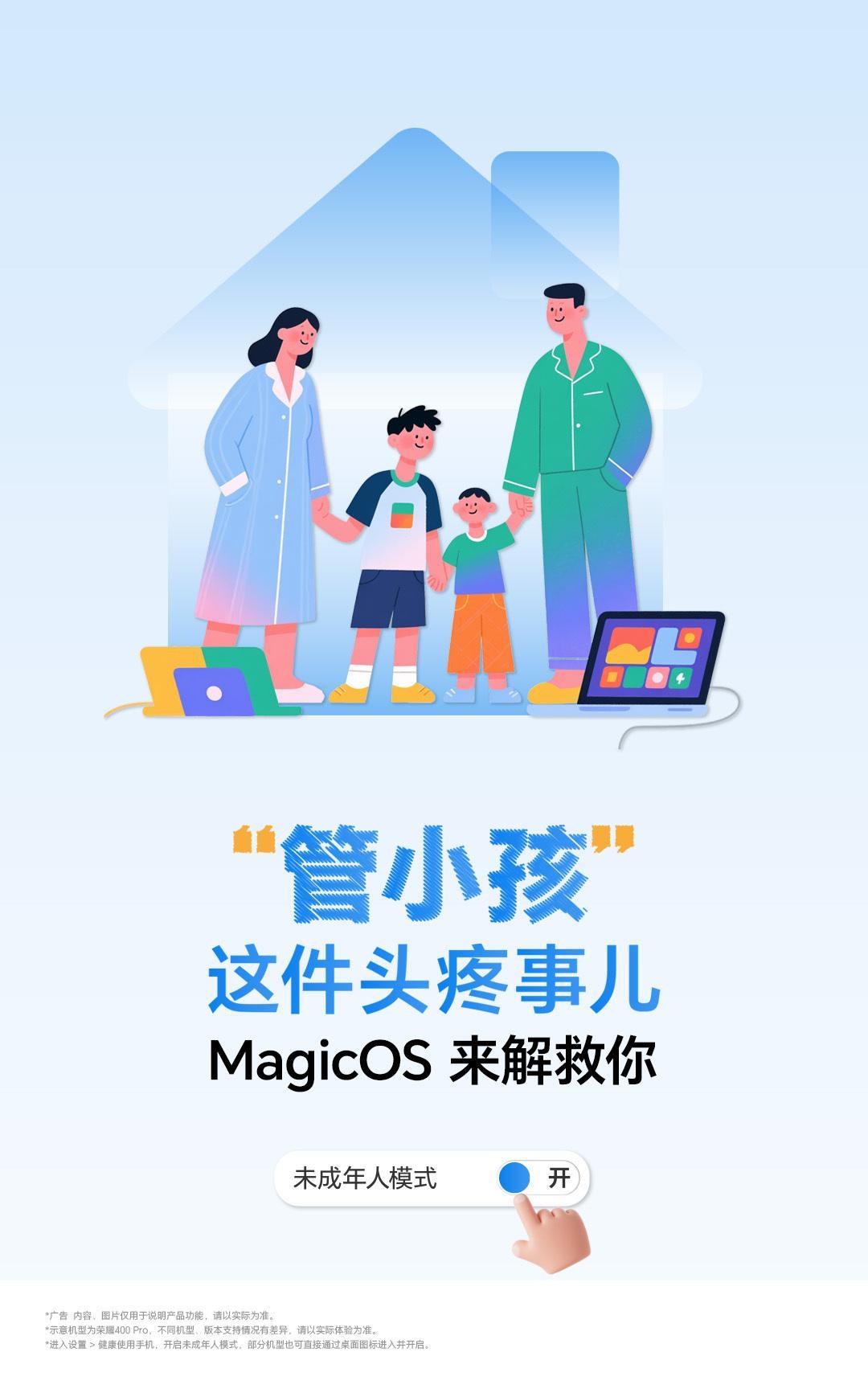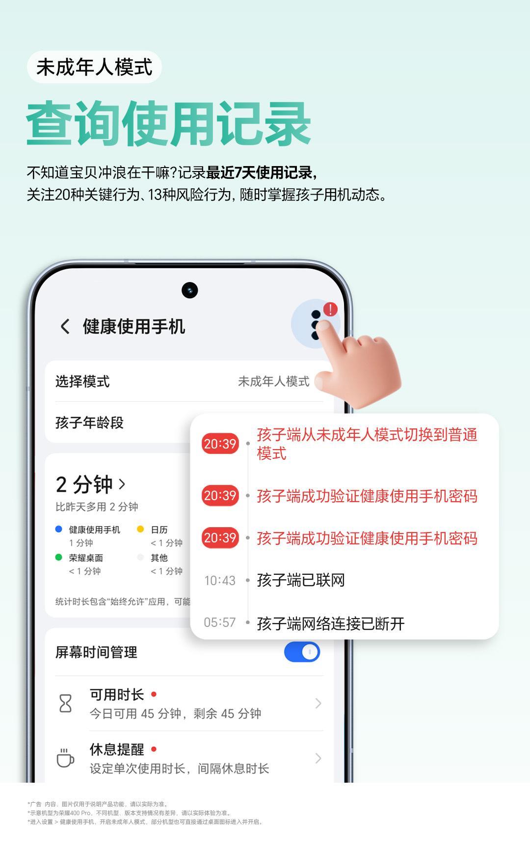 现在日常生活中孩子们会经常接触电子产品,例如智能手机、平板电脑等设备,那么怎样避免孩子们沉迷其中呢?良好的生活方式为基础,搭配荣耀MagicOS系列,未成年模式来约束孩子们使用荣耀产品,也是蛮好的解决方案,大家一起近距离了解一下。 荣耀客服通过一组图文就将这个功能解答的很清晰,未成年人模式中例如批量限制具体应用的使用时长,或者直接禁止使用。还可以查询最近7天内的使用记录,关注20种关键行为、13种风险行为。当然避免孩子更改密码,还可以设置家长手机号码。