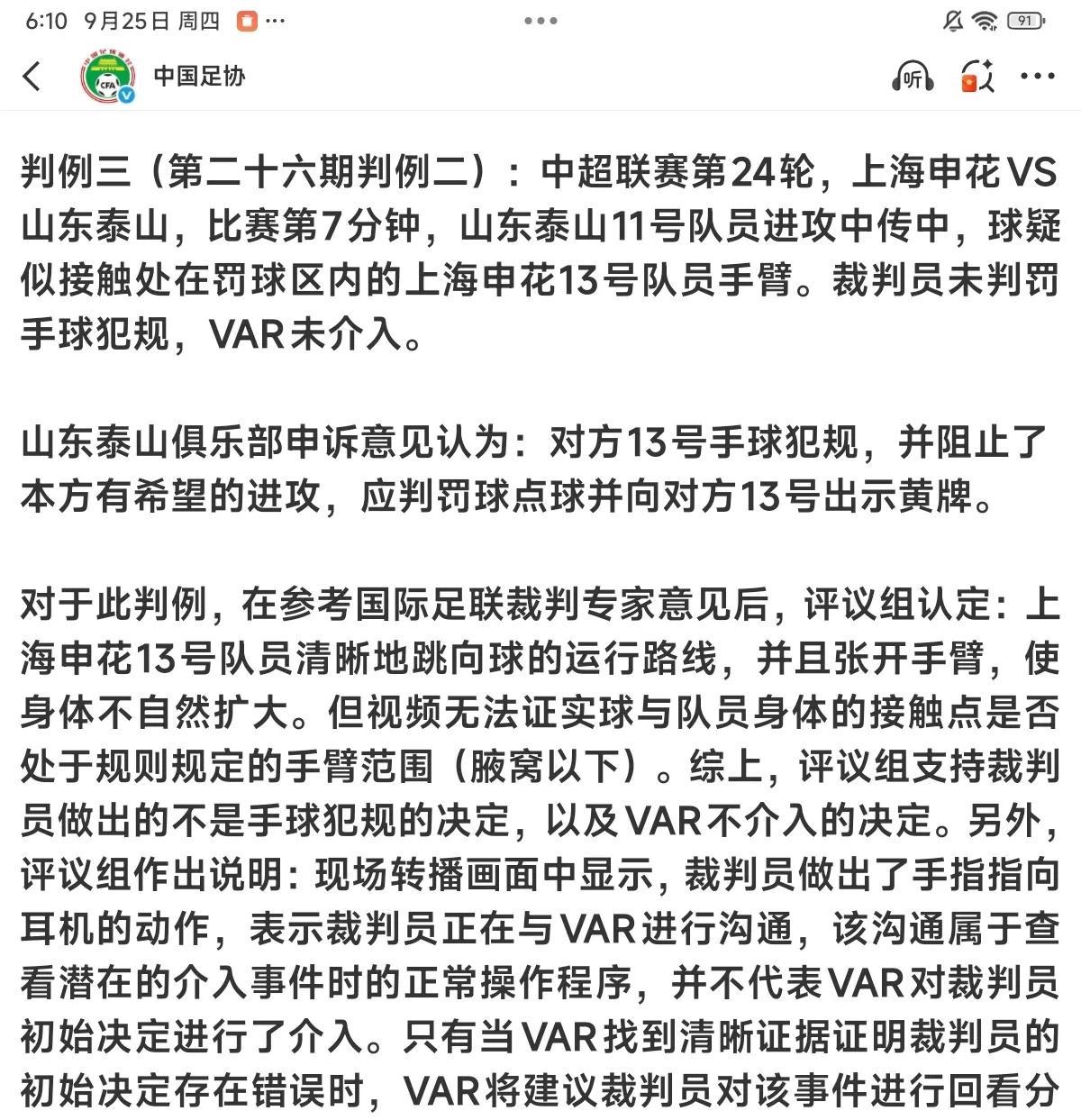 关于上海申花马纳法在对山东泰山的比赛中是否手球,国际裁判专家表示也看不清楚,这可咋整! 马纳法这个疑似手球犯规本来是上一轮山东泰山申诉的,但是足协裁判评议委员会当时认为自己无法判定,然后表示要请教国际裁判专家,一周后这国际裁判反馈了他也看不清。 其实这真不是一个判罚层次的难点,而是一个视频技术的难点,都不用请教国际裁判专家,找一个专业视频分析单位就能确定是否皮球打在马纳法的腋窝以下。 你把一个不清晰的视频给国际裁判专家,他也看不清楚,他也无法判定。