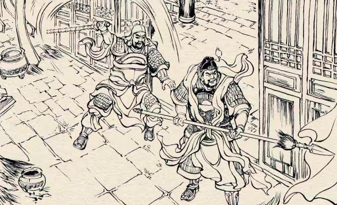 铫期在马武的掩护下,连夜冲过莽军大营,一路狂奔,却被莽军的粮台官紧追不舍。 铫期勒住马与粮台官马打对头,大枪一招白蛇吐信直奔粮台官,粮台官急用单鞭去磕,另一鞭砸向铫期。铫期用枪崩开鞭,转枪尖扎向挑粮台官腹部,粮台官一闪身,被铫期枪挑征裙,吓的他赶紧跑了。铫期这回反过来紧追粮台官。 粮台官跑进庙里,这时天还未亮,庙内漆黑一片。铫期手握长枪进入庙内,冷不丁粮台官一鞭打在他的后背上。但铫期紧咬牙关,不出声,还笑着说:“粮台官,你小子也不找准了打,你在哪儿呢?快出来决一死战。”粮台官以为刚才打在门框上了,躲在一旁大气不敢出。 铫期骂骂咧咧让粮台官出来,他有伤不敢再交战,悄悄出门,骑上马跑了。