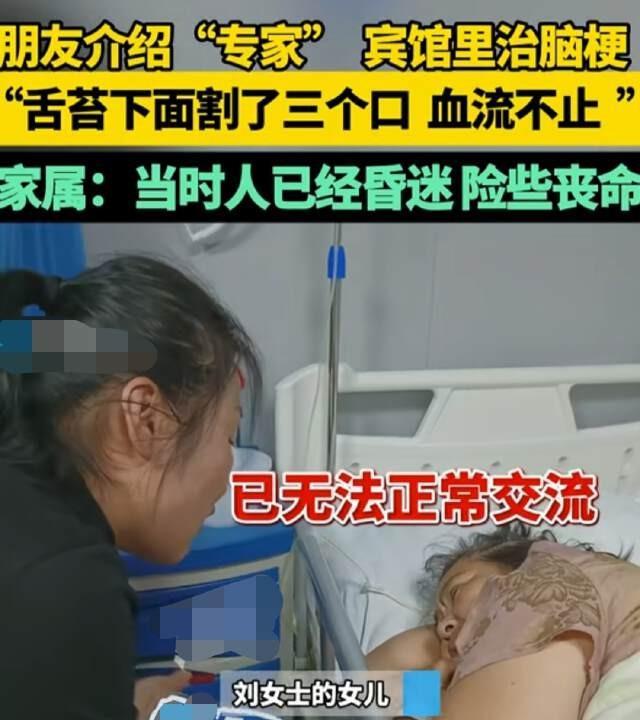 河南安阳,一女子在朋友的介绍下,通过短视频平台找到了治疗脑梗的“神医”。女子支付了两万元的治疗费,并在神医的要求下来到一家宾馆接受治疗。神医在女子的舌头上割了三个口子后,女子血流不止,而神医竟然跑了。女子家人在宾馆找到女子后,女子仍然在流血,甚至已经神志不清了,吓得家人赶紧把她送到医院。女子家人想找所谓的“神医”时,却发现已经联系不上他了。 据都市报道9月23日报道,刘女士今年六十多岁,患有脑梗。 一天,刘女士的朋友介绍给刘女士一位“神医”。这名神医是朋友在短视频平台刷到的,声称在舌头上面割个小口子,把“污血”放掉就能根治脑梗。 看着神医发的宣传案例和视频,刘女士心动了。案例里面的都是和她年纪差不多大、甚至比她还大的人,在神医的放血治疗后,他们一个个都变得生龙活虎。 就这样,刘女士加上了神医的联系方式,把两万元的治疗费转过去后,和神医约定了接受治疗的时间和地点,刘女士没有把这件事告诉家人。 到了约定的时间,刘女士独自来到了神医和她约定的一家宾馆里,决定在这里接受治疗。 刘女士满心欢喜地躺在床上,忍痛让神医在自己舌头上割了三个口子,可她很快就血流不止,几乎快要晕厥过去。 刘女士的家人发现刘女士不知道去哪了,便赶紧给她打电话,刘女士如实把自己的位置告诉了家人,家人匆忙赶了过来。 可一打开房间门,眼前的场景让所有人都大吃一惊。宾馆里只有刘女士一个人,床上、刘女士身上都是血,她的意识已经模糊,吓得家人赶紧把她送到了医院。 在医院经过一番抢救后,刘女士勉强保住了一条命,可她仍然处于神志模糊的状态,没有办法与人正常交流,也说不清到底发生了什么。 刘女士家人通过她手机上的聊天记录和短视频浏览记录,才得知了刘女士独自去找神医治疗脑梗的事情。而当家人想联系那个神医时,却发现已经联系不上了。 那么,这件事中都涉及到了哪些法律问题呢? 一、“神医”的行为属于非法行医。 根据《刑法》第三百三十六条,未取得医生执业资格的人非法行医,情节严重的,构成非法行医罪。 如果神医没有医生执业资格就为刘女士进行医疗手术,并且导致刘女士血流不止、意识模糊等严重情况,就已经属于非法行医。 即使神医有相关医生执业资格,其在宾馆这种没有安全设施、消毒不彻底的地方进行医疗行为,也可能构成非法行医。 二、“神医”在短视频平台的宣传视频违反了广告法。 根据《广告法》第十七条,除医疗、药品、医疗器械广告外,禁止其他任何广告涉及疾病治疗功能,并不得使用医疗用语或者易使推销的商品与药品、医疗器械相混淆的用语。 另外,如果给刘女士介绍神医的这位朋友在明知神医不靠谱的情况下,仍然把神医介绍给刘女士,其也应该承担相应责任。 那么,对于这件事您有何看法呢? 素材来源:都市报道 9月23日