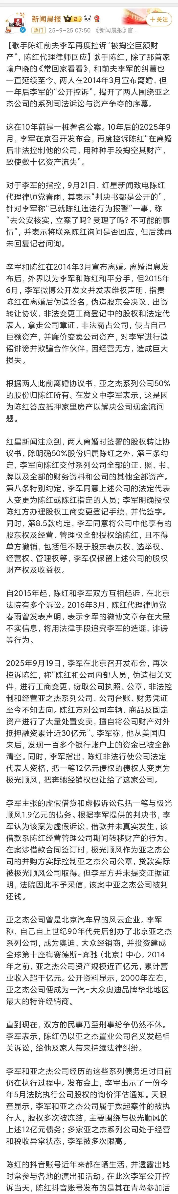 今天最大的瓜,是歌手陈红的,涉及百亿资金! 9月25日上午,歌手陈红的前夫李军,突然冲上热搜,原因是他最近再次发文控诉陈红“掏空他巨额财产”。 陈红和李军2014年离婚后就互相诉讼多次,但至今未有明确结果。 李军指责陈红伪造他签名非法变更工商登记中的股权和法人,并擅自用公司财产抵押融资30亿,并同时将100多个账户上的100多亿转移,导致他的别墅、迈巴赫、以及住房公积金都已经被法院强制执行。 陈红则称李军隐藏资金11亿,并擅自加大公司债务负担高达17亿。 目前李军的诉求是陈红归还他公司执照与股权,并称已经报警,而陈红的回应是“去公安核实,立案了吗?受理了吗?” 真是想不到陈红歌唱这么好,离婚居然也这么精彩,唱了1首歌,却打了10年争产官司,有网友评价,陈红比翟欣欣狠多了,个人感觉不至于,而且李军曾经有过翻墙打某美女主持人的不良记录,只能说,两人都不是省油的灯啊。