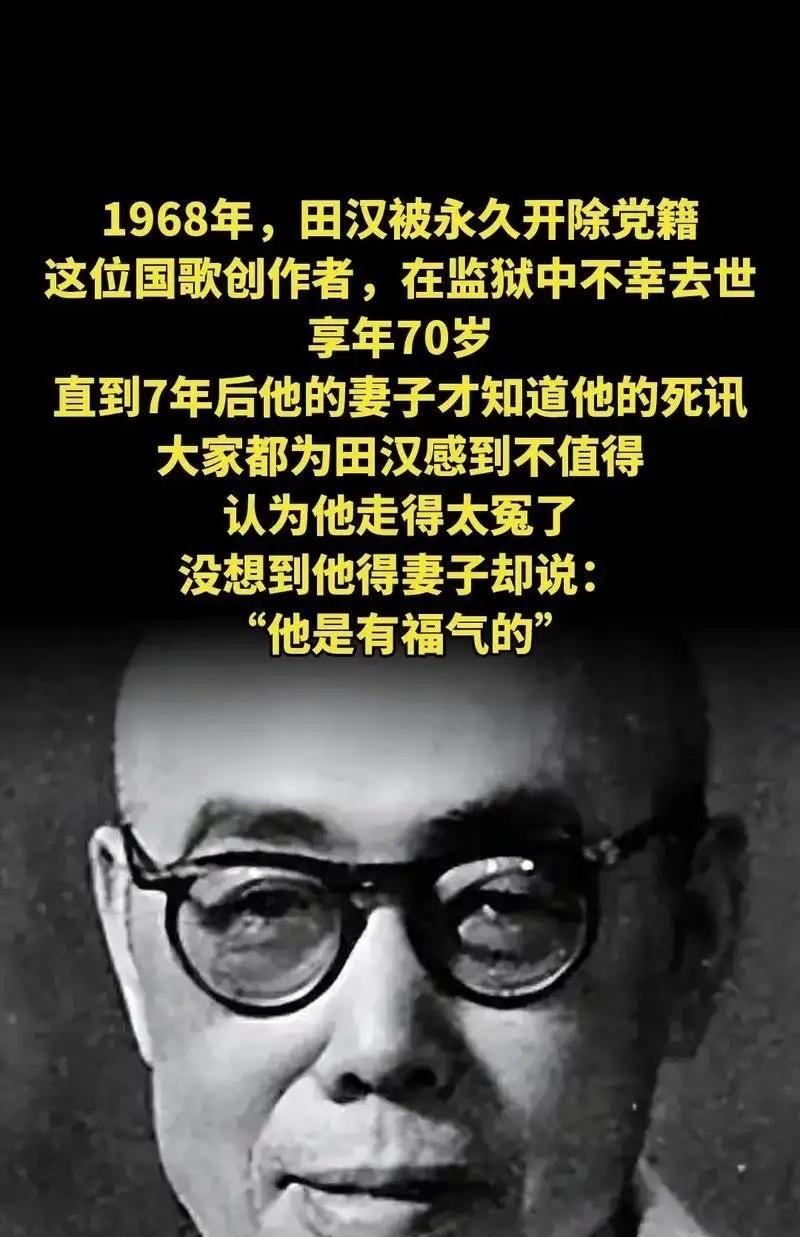1968年,“国歌之父”田汉被永久开除党籍,最终在监狱中去世,许多人认为他是冤枉死的,七年后,田汉的妻子才得知真相,没过一年,她也随他而去。 提起田汉,哪怕不熟悉文艺界的人,也该知道他笔下那句“起来!不愿做奴隶的人们!”。《义勇军进行曲》后来成了国歌,每次响起都能让人心里涌起一股劲,可写出这样激昂文字的人,却在人生最后一段路走得那么憋屈。 他一辈子都在为文艺事业奔忙,早年搞话剧、写剧本,把对国家、对人民的感情都揉进作品里,怎么看都不该落得被开除党籍、在监狱里离世的下场。 更让人心里不是滋味的是,他走了七年,妻子安娥才知道真相。这七年里,安娥该是抱着怎样的期待在等?或许每天都在盼着丈夫能平安回来,能跟她说说这些年到底经历了什么。 可当真相砸过来的时候,这份期待瞬间碎成了渣。一个人心里的支撑没了,身体也跟着垮了,没过一年就随田汉而去,想想都觉得揪心。 其实不光是田汉,那个特殊年代里,还有不少像他一样的人,明明为国家、为社会做了那么多贡献,却因为各种莫须有的罪名受了委屈。 他们的才华被埋没,他们的尊严被践踏,甚至连家人都要跟着承受痛苦。田汉的遭遇,不只是他一个人的悲剧,更是一个时代的遗憾。 后来,田汉的冤案得到了平反,历史终于还了他一个公道。可那些失去的时光,那些承受的痛苦,再也回不来了。 我们现在提起田汉,会记得他是“国歌之父”,会歌颂他的才华和贡献,可更该记得他曾经历的不公。记住这些,不是为了沉溺于过去的伤痛,而是为了提醒自己,要珍惜现在的法治和公正,不能让类似的悲剧再发生。 田汉用文字唤醒过无数人,他的作品里藏着对国家最深沉的爱。就算经历了那么多磨难,这份爱也从来没有变过。 而我们,能做的就是带着这份敬意,传承他的精神,让更多人知道,曾经有这样一位文人,用一生诠释了什么是家国情怀,也承受了不该有的苦难。 各位读者你们怎么看?欢迎在评论区讨论。